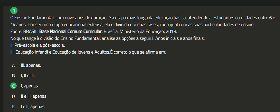 1 0 Ensino Fundamental, com nove anos de duração, é a etapa mais longa da educação básica, atendendo a estudantes com idades entre 6 e 14 anos. Por ser uma etapa educacional extensa, ela é dividida em duas fases, cada qual com as suas particularidades de ensino. Fonte: BRASIL. Base Nacional Comum Curricular. Brasília: Ministério da Educação, 2018. No que tange à divisão do Ensino Fundamental, analise as opções a seguir:l. Anos iniciais e anos finais. II. Pré-escola e a pós-escola. III. Educação Infantil e Educação de Jovens e Adultos.É correto que se afirma em: A III, apenas. I, e III. I, apenas. D e III, apenas. E le II, apenas.