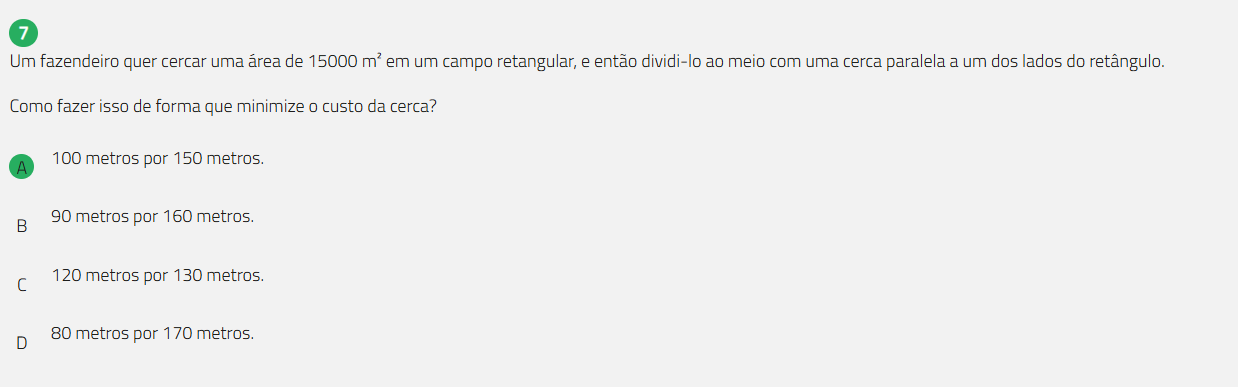 7 Um fazendeiro quer cercar uma área de 15000 em um campo retangular, e então dividi-lo ao meio com uma cerca paralela a um dos lados do retângulo. Como fazer isso de forma que minimize 0 custo da cerca? A 100 metros por 150 metros. 90 metros por 160 metros. 120 metros por 130 metros. D 80 metros por 170 metros.