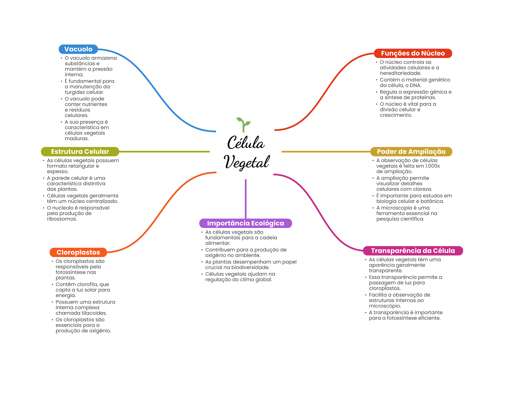 Vacuolo Funções do Núcleo substâncias núcleo controla as mantém a pressão atividades celulares . a fundamental para Contém material genético a manutenção da da DNA. turgidez celular. Regula a expressão gênica . vacuolo pode a sintese de conter nutrientes núcleo vital para a divisão celular celulares. A presença é em maduras. Estrutura Celular Poder de Ampliação As vegetals A observação de formato é em espesso. de ampliação. A parede celular é uma A ampliação permite característica distintiva visualizar das plantas. celulares com vegetale É importante para estudos em têm um núclso . botânica. nucleolo responsável A microscopia uma pela produção de essencial na ribossomos. pesquisa Importância Ecológica As são para a cadela alimentar. Cloroplastos Contribuem para a produção de Transparência da Célula oxigênio no são As desempenham um papel As têm uma na aparência nas ajudam na plantas. regulação do clima Essa transparência permite a que passagem de luz para capta a luz solar para energia. Facilita a de uma estrutura estruturas ao complexa microscópio. chamada A transparência para a para a produção de