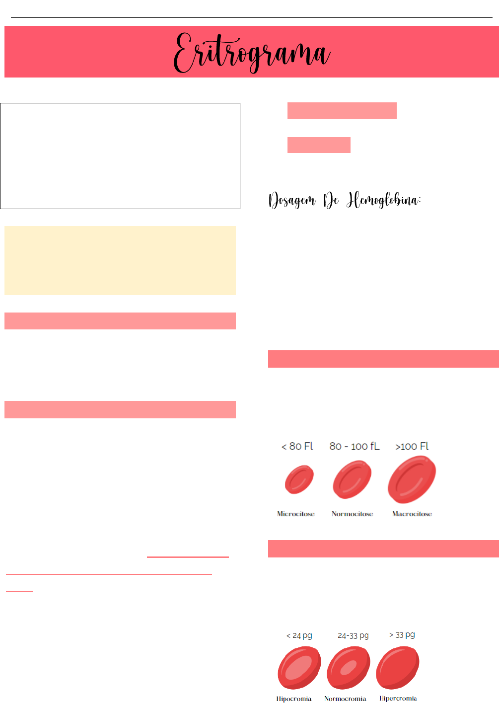 @juliana_studies - é uma das partes que compõem o hemograma - avalia a massa erirocitária circulante e tambem os seus precursores produzidos na medula óssea - composto por alguns parametros, uns determinados diretamente, outros, derivados dessas determinações - Esses parâmetros analisados em conjunto dão pistas para diagnóstico de vários distúrbios como anemias e poliglobulias (excesso de glóbulos vermelhos) ANÁLISE DIRETA: → Contagem de eritrócitos → Dosagem de hemoglobina → VCM PARÂMETROS DERIVADOS: → Hematócrito - proporção do volume de hemácias em relação ao volume de sangue total, é expresso em percentual → HCM → CHCM → RDW CONTAGEM DE ERITRÓCITOS: é analisada sempre em conjunto com outros dados, nunca de forma isolada - Os eritrócitos são contados por aparelho (impedância), seu resultado é lido em microlitro ou em milímetro cúbico - Valores de referencia para adultos: Homem: 4,5 – 6,1 milhões/L Mulher: 4,0 – 5,4 milhões/L ➢ Eritrocitose ou poliglobulia: aumento na quantidade de eritrócitos ➢ Eritrocitopenia: diminuição da quantidade de eritrócitos também realizada em aparelho automatizado, por espectrofotometria - Sua quantidade normal varia em diferentes situações como sexo e idade - Valores de referência: Homem: 14 – 18 g/dL Mulher: 12 – 16 g/dL VCM – VOLUME CORPUSCULAR MÉDIO - Corresponde à média do tamanho de eritrócitos. - Valor de Referência: 80 – 100 fL (fentolitros) ➢ Microcitose: VCM 100 fL HCM – HEMOGLOBINA CORPUSCULAR MÉDIA - É a quantidade média de hemoglobina por eritrócito - Calculado por equipamento eletrônico - Resumindo, agora o assunto é a coloração. Sabe aquele halo no centro da hemácia? Então, é ele que vai variar! Pg = picograma @juliana_studies - antigamente se dizia que a hemácia estava hipercrômica, mas esse termo já está em desuso, até porque existe uma outra alteração chamada esferocitose, que é exatamente igual a hipercromia, então... nesses casos, invés de falar que a hemácia está hipercrômica, optamos por dizer que na lâmina visualizamos alguns esferócitos em poiquilocitose. CHCM – CONCENTRAÇÃO DE HEMOGLOBINA CORPUSCULAR MÉDIA - CHCM = Hemoglobina / Hematócrito ou CHCM = HCM / VCM - Valor de referência: 31 a 36% ou g/dL - o aumento verdadeiro geralmente ocorre em pacientes com esferocitose RDW – RED CELL DISTRIBUTION WIGTH - Esse índice é medido apenas em aparelhos automatizados. O RDW corresponde a heterogeneidade do tamanho das hemácias. - Valores de referência: 11,5 – 14,5% - Termo utilizado: Anisocitose: RDW > 14,5% ANISOCITOSE: variação no tamanho das hemácias – é uma característica da maioria das anemias ANISOCROMIA: eritrócitos com variação na coloração ou grau de hemoglobina - varia entre hipocromia, normocromia e hipercromia, ou seja, pode ocorrer pela presença de eritrócitos pobres ou ricos em hemoglobina. POIQUILOCITOSE: - presença de poiquilócitos (eritrócitos de formas anormais) no sangue - os eritrócitos nromais são discos ovais e achatados, mais finos no centro, já os poiquilócitos, possuem alguma distorção dessa forma ou possui uma forma totalmente diferente. - considera-se poiquilocitose quando há um aumento de 25% de eritrócitos anormais (forma de foice): os eritrócitos acabam adquirindo essa forma por causa da hemoglobina S, que ocasiona uma deformação - é encontrado em doenças como anemia falciforme ao invés de possuir o formato mais achatado de “bala soft”, esses eritrócitos são mais arredondados - quando observados no microsc[opio, perdem a zona clara central e são mais densos - podem ser causados por defeitos de proteínas de membrana de causa genética, ou nos caos de anemia hemolítica autoimune, que nesse caso é adquirida @juliana_studies : apresentam formas ovaladas e elíptocíticas - sua causa é por problemas genéticos nas proteínas que formam o “citoesqueleto da célula - podem ser encontrados em talassemias, anemia ferropriva e anemia megaloblástica (hemácias em alvo): há uma dupla biconcavidade no eritrócito e a hemoglobina é visualizada no meio do eritrócito, dando uma aparência de alvo. - podem ser encontrados em hemoglobinopatias, hepatopatias, talassemias, na anemia ferropriva e em pacientes que foram esplenectomizados (tiveram seu baço removido) (forma de lágrimas): possuem uma forma que se assemelha a uma gota ou lágrima : hemácias com a membrana irregular e que apresentam espículas distribuídas de forma regular. - in vitro pode ser artefato - in vivo pode ser relacionado à hiperuremia, tratamento com heparina IV, hipotireoidismo ou pós transfusão sanguínea : possuem halo central semelhante a uma boca de peixe - pode ser um artefato causado pela distensão sanguínea - ou pode estar presente em hepatopatias, sangue de recém-nascido e na estomatocitose hereditária (anemia congênita muito rara) não tem uma forma exata, possuem esse nome por serem "esquisitos Podem estar presentes em: traumas mecânicos, válvulas cardíacas artificiais, agressão térmica por queimaduras, agressão química por fármacos, coagulação intravascular disseminada (CIVD), púrpura trombocitopênica Trombótica (PTT) e Síndrome Hemolítica Urêmica.