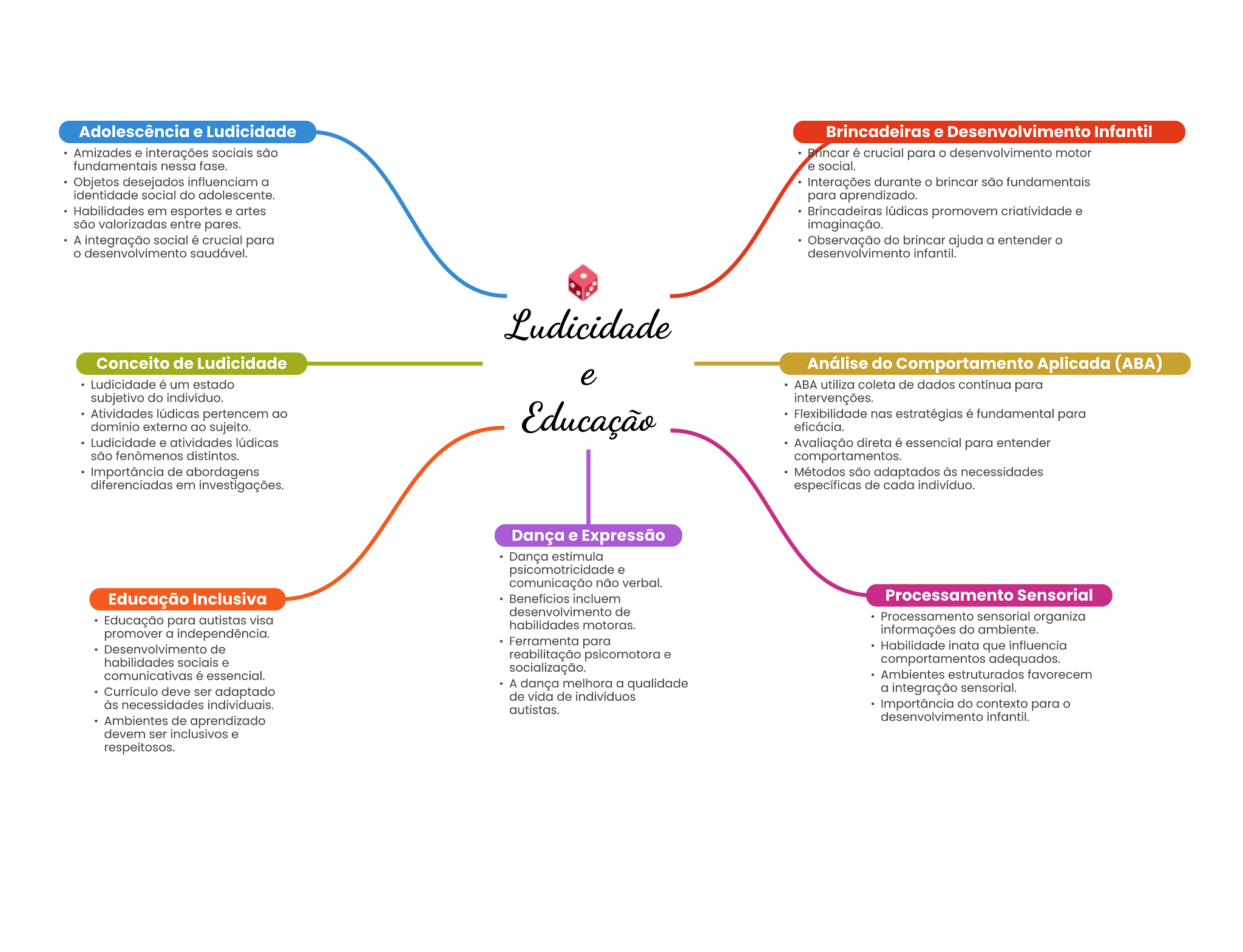 Adolescência e Ludicidade Brincadeiras e Desenvolvimento Infantil Amizades são Brincar é para o motor fundamentale social. Objetos a durante brincar social do para aprendizado. Habilidades em . artee lúdicas promovem criatividade e entre pares. A social crucial para Observação do brincar ajuda a entender Conceito de Ludicidade Análise do Comportamento Aplicada (ABA) Ludicidade um estado ABA utiliza coleta de dados continua para subjetivo do individuo. intervenções. Atividades pertencem Flexibilidade nas fundamental para externo ao Ludicidade . atividades Avaliação direta essencial para entender fenômenos distintos. comportamentos. de abordagens Métodos são adaptados necessidades diferenciadas em investigações. específicas de cada Dança e Expressão Dança estimula comunicação não verbal. Educação Inclusiva Beneficios Processamento Sensorial desenvolvimento de Educação para autistas visa Processamento sensorial organiza habilidades motoras. promover a do ambiente. Ferramenta para de Habilidade que influencia socials reabilitação palcomotora . comportamentos adequados. comunicativas estruturados favorecem A dança a qualidade Currículo deve ser adaptado a sensorial. de vida de necessidades individuals. autistas. do contexto para o de aprendizado devem ser