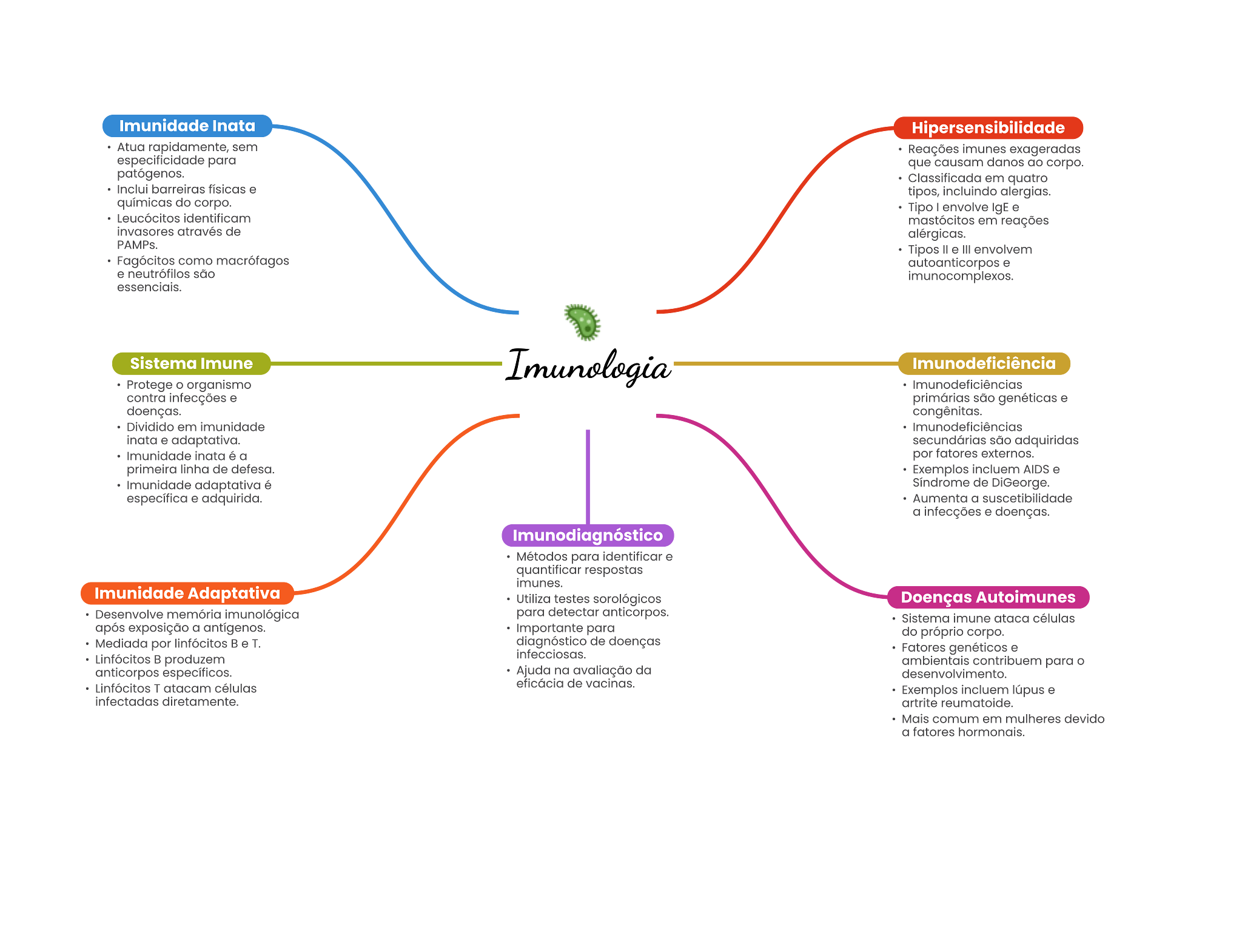 Imunidade Inata Hipersensibilidade Atua rapidamente, Imunes exageradas para que danos corpo. patógenos. em quatro Inclui tipos, alergias. do corpo. Tipo I envolve IgE . Leucócitos identificam em reações atravée de PAMPs. Tipoa I envolvem Fagócitos como autoanticorpos . são Sistema Imune Imunodeficiência Protege organismo Imunodeficiências contra a primárias são genéticas . doenças. Dividido em Inata adaptativa. são adquiridas Inata é a por externos. primeira linha de Exemplos AIDS . adaptativa de DiGeorge. específica . adquirida. a a Infecções e Imunodiagnóstico Métodos para quantificar respostos Imunes. Imunidade Adaptativa Utiliza Doenças Autoimunes Desenvolve memória para detector anticorpos. Sistema Imune ataca após exposição a importante para do próprio corpo. Mediada por diagnóstico de doenças Fatores genéticos produzem contribuem para o anticorpos Ajuda na da desenvolvimento. Linfócitos T de vacinas. Exemplos lúpus artrite reumatoide. comum em mulheres devido a fatores