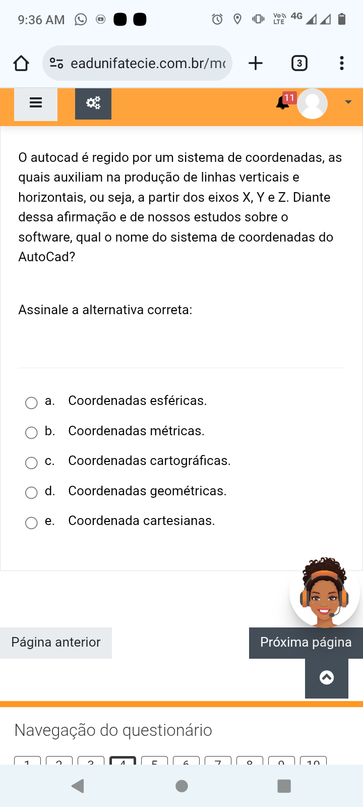 9:36 AM 4G LTE + 3 11 0 autocad é regido por um sistema de coordenadas, as quais auxiliam na produção de linhas verticais e horizontais, ou seja, a partir dos eixos X, Y e Z. Diante dessa afirmação e de nossos estudos sobre o software, qual o nome do sistema de coordenadas do AutoCad? Assinale a alternativa correta: a. Coordenadas esféricas. b. Coordenadas métricas. C. Coordenadas cartográficas. d. Coordenadas geométricas. e. Coordenada cartesianas. Página anterior Próxima página Navegação do questionário 1 7 10