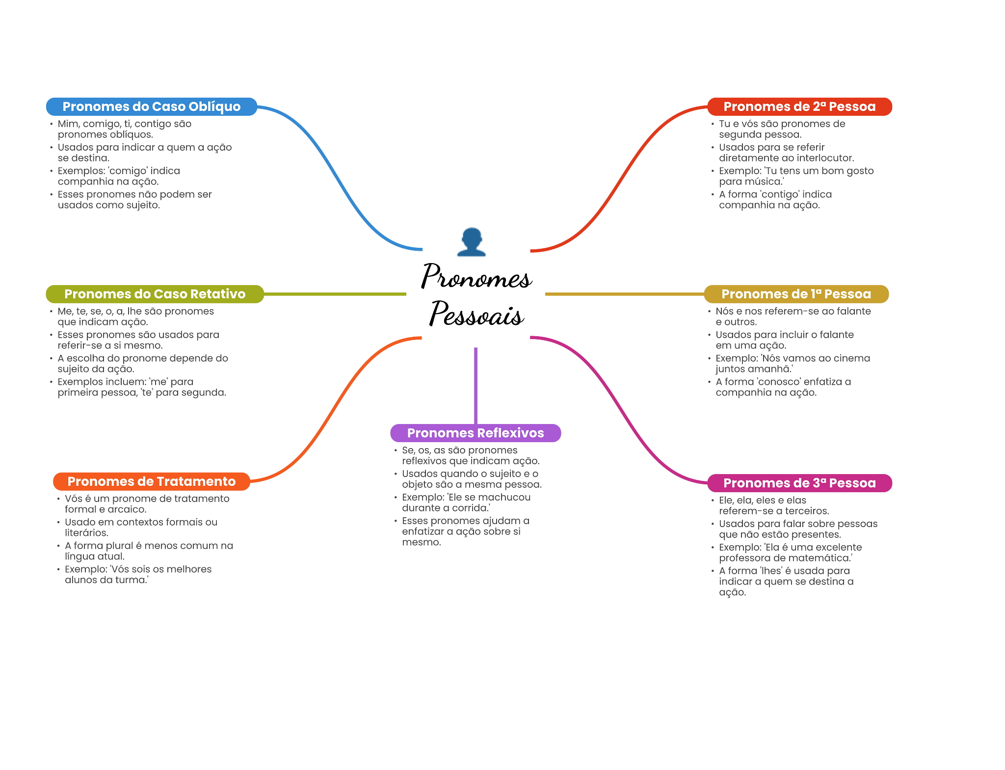 Pronomes do Caso Oblíquo Pronomes de 2a Pessoa comigo, ti, contigo são Tu . de pronomes oblíquos. segunda pessoa. Usados para a quem a ação Usados para se referir destina. diretamente Exemplos: Exemplo: Tu tene um bom gosto companhia na ação. para Esses pronomes não podem ser A forma Indica usados como sujeito. companhia na ação. Pronomes do Caso Retativo Pronomes de Pessoa to, a, pronomes e nos falante que ação. outros. pronomse usados para Usados para o falante a al meemo. em uma ação. A escolha do pronome depende do Exemplo: vamos cinema sujeito da ação. juntos Exemplos 'me' para A forma a primeira para segunda. companhia na ação. Pronomes Reflexivos são pronomes que indicam ação. quando o sujeito o Pronomes de Tratamento objeto a mesma Pronomes de Pessoa um pronome de tratamento Exemplo: se machucou . formal . durante a referem-se a terceiros. Usado em formale ou Essas pronomes ajudam a Usados para falar sobre a ação sobre al que não estão presentes. A forma plural menos comum na uma excelente lingua professora de Exemplo: sols melhores A forma é usada para alunos da a quem a ação.