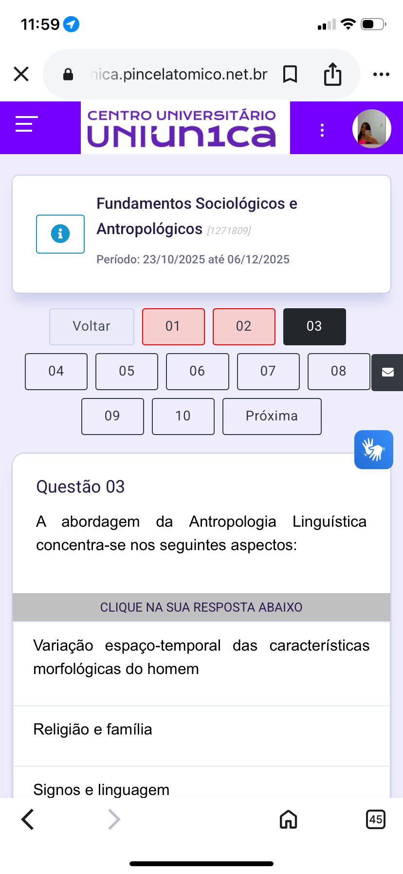 11:59 X nica.pincelatomico.net.br CENTRO UNIVERSITÁRIO ... Fundamentos Sociológicos e i Antropológicos [1271809] Período: 23/10/2025 até 06/12/2025 Voltar 01 02 03 04 05 06 07 08 09 10 Próxima Questão 03 A abordagem da Antropologia Linguística concentra-se nos seguintes aspectos: CLIQUE NA SUA RESPOSTA ABAIXO Variação espaço-temporal das características morfológicas do homem Religião e família Signos e linguagem 45