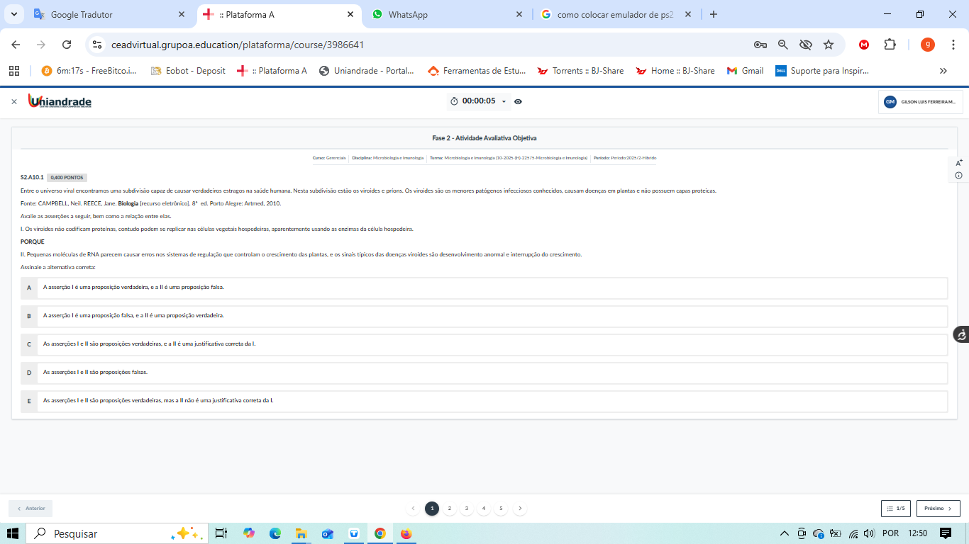 Google Tradutor X + Plataforma A X WhatsApp como colocar emulador de ps2 + X ceadvirtual.grupoa.education/plataforma/course/3986641 - g 00 6m:17s Eobot Deposit Plataforma A Uniandrade Portal... Ferramentas de Estu... Torrents BJ-Share Home BJ-Share M Gmail Suporte para Inspir... X 00:00:05 GM GILSON LUIS FERREIRAM Fase 2 Atividade Avaliativa Objetiva Microbiologia 2025 Hibrido PONTOS Entre universo viral encontramos uma subdivisão capaz de causar verdadeiros estragos na saúde humana. Nesta subdivisão estão viroides Os viroides são menores patógenos infecciosos causam doenças em plantas não possuem capas Fonte: Biologia ed. Porto Alegre: 2010. Avalie as asserções a seguir, bem como relação entre Os viroides não codificam contudo podem replicar nas células vegetais aparentemente usando as enzimas da PORQUE II. Pequenas moléculas de RNA parecem causar erros nos sistemas de regulação que controlam crescimento das os sinais tipicos das doenças são desenvolvimento anormal interrupção do Assinale alternativa correta: A A asserção é uma proposição verdadeira, a uma proposição B A asserção é uma proposição falsa, a uma proposição C As asserções são proposições e a e uma justificativa correta da D As asserções e são proposições E As asserções e são proposições mas não uma justificativa correta da Anterior 1/5 Pesquisar POR 12:50