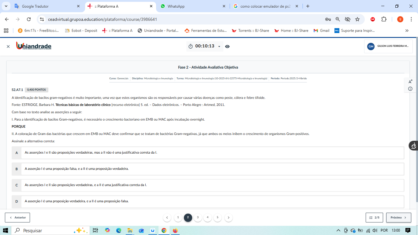 Google Tradutor X : Plataforma A X WhatsApp como colocar emulador de ps2 + X ceadvirtual.grupoa.education/plataforma/course/3986641 - g 00 6m:17s Eobot Deposit Plataforma A Uniandrade Portal... Ferramentas de Estu... Torrents BJ-Share Home BJ-Share Gmail Suporte para Inspir... Uniandrade 00:10:13 GM GILSON LUIS FERREIRA Fase 2 Atividade Avaliativa Objetiva Curso: Gerenciais Disciplina: Microbiologia Imunologia Turma: Microbiologia Imunologia e S2.A7.1 0,400 PONTOS i A identificação de bacilos gram-negativos é muito uma vez que estes organismos são os responsáveis por causar doenças como cólera e febre tifoide. Fonte: Barbara H. Técnicas de laboratório clínico 5. ed. - - Dados - Porto Alegre 2011. Com base no texto analise as asserções a seguir: Para a identificação de bacilos é necessário crescimento bacteriano em EMB ou MAC após incubação overnight. PORQUE II. A coloração de Gram das bactérias que crescem em EMB ou MAC deve confirmar que se tratam de já que ambos os meios inibem crescimento de organismos Gram-positivos. Assinale a alternativa correta: A As asserções e II são proposições verdadeiras, mas a II não é uma justificativa correta da B A asserção é uma proposição falsa, e a II é uma proposição verdadeira. C As asserções e II são proposições verdadeiras, e a II é uma justificativa correta da D A asserção é uma proposição e a II é uma proposição falsa. 2/5 > Pesquisar POR 13:00