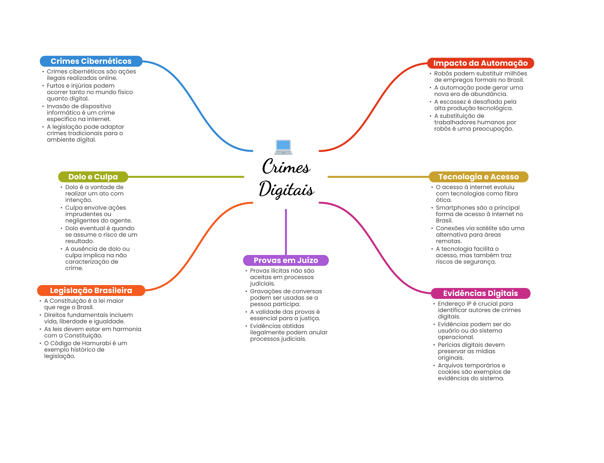 Crimes Cibernéticos Impacto da Automação Crimes são Robôs podem substituir milhões realizados online. de empregos no Furtos podem A automação pode gerar uma ocorrer tanto no mundo físico nova era de quanto digital. A pela de dispositivo alta produção tecnológica. informático um crime específico na A substituição de trabalhadores humanos por A pode adaptar uma crimes para ambiente digital. Dolo e Culpa Tecnologia e Acesso Dolo é a vontade de acesso à internet evolutu um ato com com como fibra intenção. ótica. envolve ações Smartphones são a principal ou forma de acesso à no do agents. Dolo eventual quando via são uma assume risco de um alternativa para resultado. remotas. A de dolo ou A tecnología facilita o culpa implica na não acesso, traz caractertzação de Provas em Juízo riscos de segurança. crime. Provas não são em processos judicials. Legislação Brasileira Gravações de conversas A Constituição é a podem usadas a Evidências Digitais que rege pessoa participa. Endereço IP crucial para Direitos incluem A validade das provas identificar autores de crimes essencial para a justiça. vida, liberdade e Evidências obtidos Evidências podem do As devem em harmonia podem anular usuário ou do com a Constituição. processos operacional. Código de Hamurabi é um exemplo histórico de legislação. Arquivos temporários cookies são de evidências do sisterna.
