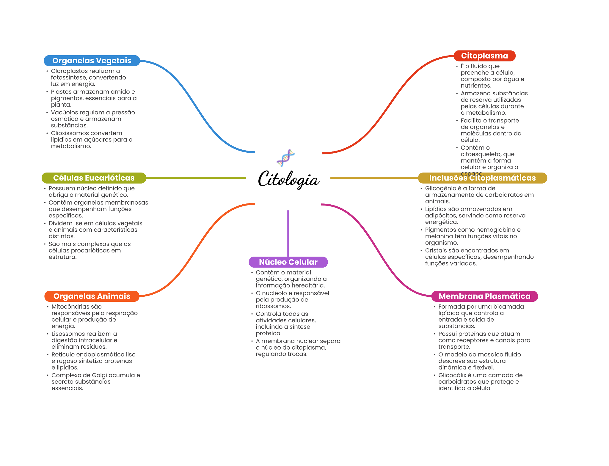 Citoplasma Organelas Vegetais fluido que realizam a preenche a convertendo composto por água . luz em energia. nutrientes. Plastos amido substâncias pigmentos, essencials para a de reserva utilizadas durante a pressão metabolismo. transporte substâncias. de . convertem dentro da lipídios em para metabolismo. o que a forma organiza Células Eucarióticas Inclusões espaço. Citoplasmáticas Possuem núcleo definido que é a forma de abriga o material genético. de em animals. que desempenham funções são armazenados em específicas. adipócitos, servindo como reserva Dividem-se em animais com características Pigmentos como melanina têm funções vitale no São mais complexas que as organismo. em são encontrados em estrutura. desempenhando Núcleo Celular funções variadas. Contém o material genético, organizando a Informação Organelas Animais responsável pela produção de Membrana Plasmática Mitocôndrias Formada por uma responsávele pela respiração Controla todas as lipídica que controla a celular produção de atividades celulares, entrada de energia. a substâncias. a proteica. que atuam digestão A membrana nuclear como receptores . canais para eliminam o núcleo do transporte. Retículo liso regulando modelo do mosalco rugoso descreve estrutura dinâmica Complexo de acumula uma camada de secreta substâncias carboldratos que protege identifica a