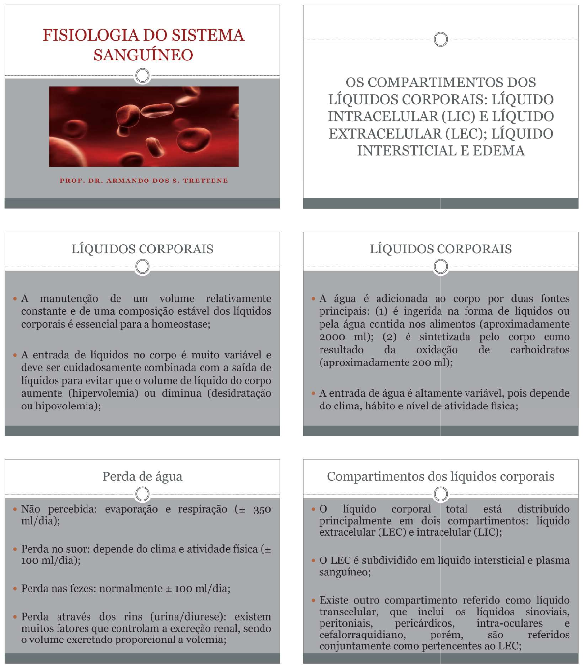FISIOLOGIA DO SISTEMA SANGUÍNEO OS COMPARTIMENTOS DOS LÍQUIDOS CORPORAIS: LÍQUIDO INTRACELULAR (LIC) E LÍQUIDO EXTRACELULAR (LEC); LÍQUIDO INTERSTICIAL E EDEMA PROF. DR. ARMANDO DOS S. TRETTENE LÍQUIDOS CORPORAIS LÍQUIDOS CORPORAIS A manutenção de um volume relativamente A água é adicionada ao corpo por duas fontes constante e de uma composição estável dos líquidos principais: (1) é ingerida na forma de líquidos ou corporais é essencial para a homeostase; pela água contida nos alimentos (aproximadamente 2000 ml); (2) é sintetizada pelo corpo como A entrada de líquidos no corpo é muito variável e resultado da oxidação de carboidratos deve ser cuidadosamente combinada com a saída de (aproximadamente 200 ml); líquidos para evitar que o volume de líquido do corpo aumente (hipervolemia) ou diminua (desidratação A entrada de água é altamente variável, pois depende ou hipovolemia); do clima, hábito e nível de atividade física; Perda de água Compartimentos dos líquidos corporais Não percebida: evaporação e respiração (± 350 líquido corporal total está distribuído ml/dia); principalmente em dois compartimentos: líquido extracelular (LEC) e intracelular (LIC); Perda no suor: depende do clima e atividade física (± 100 ml/dia); O LEC é subdividido em líquido intersticial e plasma sanguíneo; Perda nas fezes: normalmente ± 100 ml/dia; Existe outro compartimento referido como líquido Perda através dos rins (urina/diurese): existem transcelular, que inclui os líquidos sinoviais, muitos fatores que controlam a excreção renal, sendo peritoniais, pericárdicos, intra-oculares e o volume excretado proporcional a volemia; cefalorraquidiano, porém, são referidos conjuntamente como pertencentes ao LEC;Líquido Líquido Extracelular Intracelular Células Liquido intracelular (LIC) 142m Eq/L 10m Eq/L 0 4m 140m Eq/L 0 Ca++ 5m Eq/LLíquidos isotônicos, hipotônicos e hipertônicos Líquidos isotônicos, hipotônicos e hipertônicos Se a célula for colocada em uma solução hipotônica, Se a célula for colocada em uma solução hipertônica, a água irá se difundir do LEC para a célula, causando que possui uma concentração maior de solutos "inchamento" (edema); impermeantes que o líquido intracelular, água sairá da célula para o LEC, concentrando o LIC e diluindo LEC; A água continuará a se difundir pela célula diluindo o LIC até que este se torne isotônico em relação ao Nesses casos a célula irá encolher até que a LEC; osmolaridade do LIC se torne igual a do LEC; Soluções de cloreto de sódio com concentração As soluções de cloreto de sódio maiores do que 0,9% menor que 0,9%, são hipotônicas; são hipertônicas; aumenta concentração da solução aumenta pressão osmótica da solução OSMOLARIDADE A tonicidade de uma solução depende de sua concentração de solutos impermeantes; entretanto, Isotônico Hipotônico Hipertônico Concentração de sal em Movimento das moléculas alguns solutos podem permear a membrana celular; relação ao glóbulo vermelho de água Solução Solução © Solução hipertônica Soluções com a mesma osmolaridade que a célula água são ditas isosmóticas; Saida agua Os termos hiperosmótico e hiposmótico referem-se às soluções com maior ou menor osmolaridade Entrada de Entrada agua respectivamente; Composição sanguínea HEMÁCIAS OU ERITRÓCITOS sangue é composto por uma porção sólida e outra As hemácias são discos bicôncavos, porém, podem líquida; assumir outras formas, sem necessariamente alterar sua função; A porção sólida refere-se as diversas células; No homem normal, número médio de hemácias é de 5.200.000 mm³ (± 300.000), e na mulher, é de A porção líquida refere-se ao plasma; 4.700.000 mm³ (± 300.000); As hemácias ou eritrócitos são as células mais As pessoas que vivem em grandes altitudes apresentam número maior de hemácias; abundantes do sangue, e exercem como principal função, transportar a hemoglobina que, por sua vez, transporta oxigênio dos pulmões para os tecidos; hematócrito refere-se a porcentagem de sangue constituída por células (viscosidade do sangue), normalmente de 40 a 45%;Áreas do corpo que produzem hemácias Durante último mês de gestação e após nascimento, as hemácias são produzidas exclusivamente na medula óssea (interior dos ossos); Próximo aos 20 anos de idade, a medula óssea de alguns se tornam muito gordurosas, deixando de produzir hemácias; Após essa idade, a maioria das hemácias continua a ser produzida na medula óssea dos ossos membranosos, como: vértebras, esterno, costelas e íleo; Gênese das células sanguíneas PRODUÇÃO DE HEMÁCIAS medula femur óssea As hemácias iniciam sua vida na medula óssea por meio de uma célula simples, denominada como célula-tronco hematopoiética pluripotente, da célula linfoide qual derivam todas as células do sangue; célula mieloide célula-mãe Ao se reproduzir, as células-tronco se diferenciam formando outras células, distribuídas em linhagens, incluindo a linfóide (células brancas defesa) e mielóide (células vermelhas); hemácias plaquetas neutrófilos linfócitos Gênese das células sanguíneas Célula-tronco pluripotente Progenitor Progenitor As células em estágio intermediário estão mieloide linfoide comprometidas com uma linhagem particular de células, Mieloblasto sendo referidas como células-tronco comprometidas; Eritrócito Mastócito Célula NK Linfócito Por exemplo, uma célula-tronco comprometida pequeno produtora de hemácias é referida como unidade Megacariócito formadora de colônia de eritrócitos; Linfócito T Linfócito crescimento e a reprodução das diferentes células são controlados por múltiplas proteínas denominadas indutores de crescimento; Trombócitos Basófilo Neutrófilo Eosinófilo Monócito Macrófago PlasmócitoRegulação da produção das células da linhagem Gênese das células sanguíneas vermelh