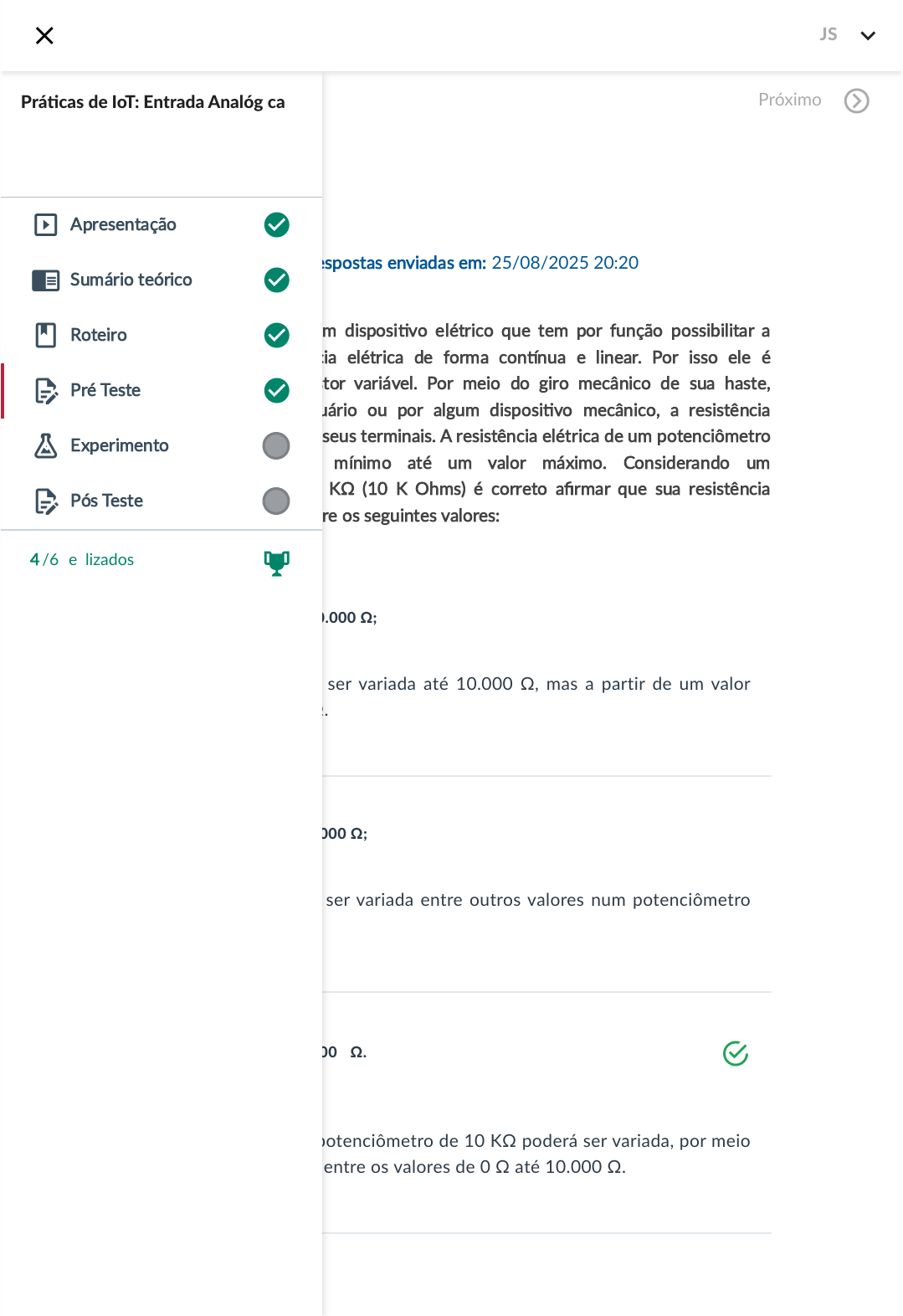 Pré Teste Respostas enviadas em: 25/08/2025 20:20 3. O potenciômetro é um dispositivo elétrico que tem por função possibilitar a variação de resistência elétrica de forma contínua e linear. Por isso ele é considerado um resistor variável. Por meio do giro mecânico de sua haste, acionada por um usuário ou por algum dispositivo mecânico, a resistência elétrica varia entre os seus terminais. A resistência elétrica de um potenciômetro varia de um valor mínimo até um valor máximo. Considerando um potenciômetro de 10 KΩ (10 K Ohms) é correto afirmar que sua resistência poderá ser variada entre os seguintes valores: Resposta incorreta. A. de 10 Ω até 10.000 Ω; A resistência poderá ser variada até 10.000 Ω, mas a partir de um valor bem menor que 10 Ω. Resposta incorreta. B. de 1 Ω até 10.000 Ω; A resistência poderá ser variada entre outros valores num potenciômetro de 10 KΩ. Você acertou! C. de 0 Ω até 10.000 Ω. A resistência de um potenciômetro de 10 KΩ poderá ser variada, por meio do giro de sua haste, entre os valores de 0 Ω até 10.000 Ω. Anterior Próximo Práticas de IoT: Entrada Analógica Apresentação Sumário teórico Roteiro Pré Teste Experimento Pós Teste 4 /6 realizados JS Voltar Próximo Anterior Próximo Práticas de IoT: Entrada Analógica Apresentação Sumário teórico Roteiro Pré Teste Experimento Pós Teste 4 /6 realizados JS