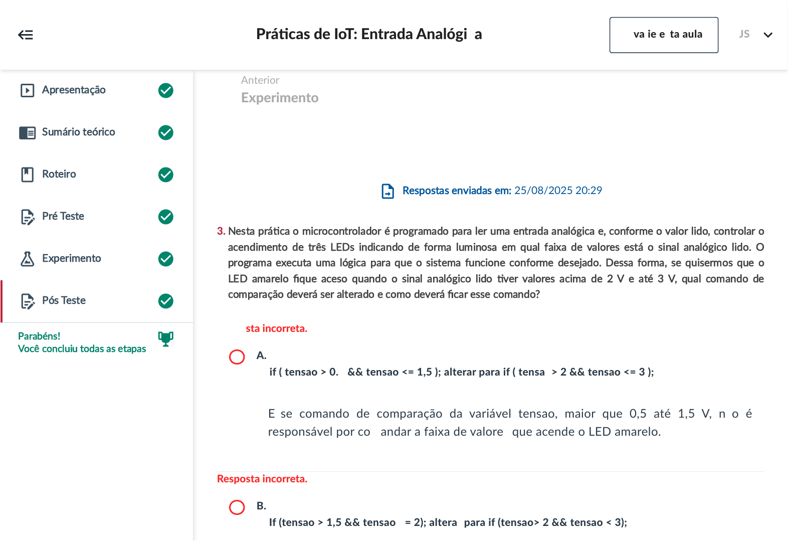 Pós Teste Respostas enviadas em: 25/08/2025 20:29 3. Nesta prática o microcontrolador é programado para ler uma entrada analógica e, conforme o valor lido, controlar o acendimento de três LEDs indicando de forma luminosa em qual faixa de valores está o sinal analógico lido. O programa executa uma lógica para que o sistema funcione conforme desejado. Dessa forma, se quisermos que o LED amarelo fique aceso quando o sinal analógico lido tiver valores acima de 2 V e até 3 V, qual comando de comparação deverá ser alterado e como deverá ficar esse comando? Resposta incorreta. A. if ( tensao > 0.5 && tensao 2 && tensao 1,5 && tensao 2 && tensao 1,5 && tensao 2 && tensao 2 e > 3 de 5 perguntas Voltar Próximo Anterior ExperimentoApresentação Sumário teórico Roteiro Pré Teste Experimento Pós Teste Parabéns! Você concluiu todas as etapas Práticas de IoT: Entrada Analógica Avalie esta aula JS