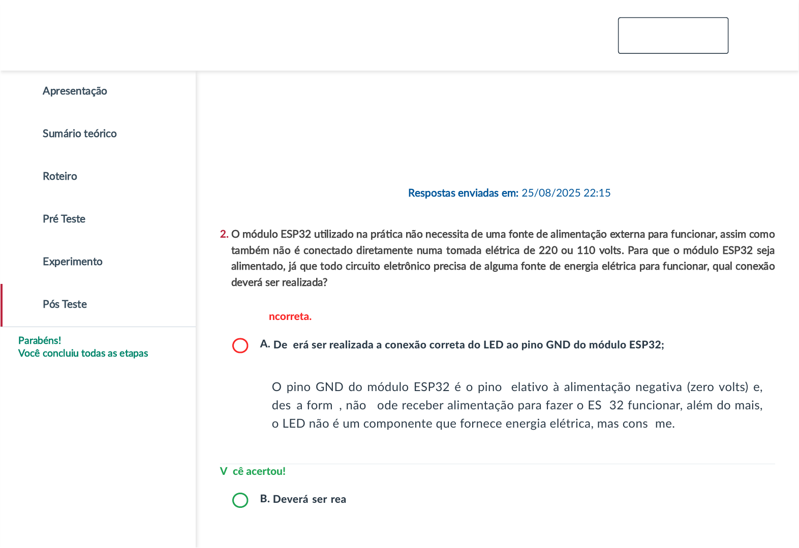 Pós Teste Respostas enviadas em: 25/08/2025 22:15 2. O módulo ESP32 utilizado na prática não necessita de uma fonte de alimentação externa para funcionar, assim como também não é conectado diretamente numa tomada elétrica de 220 ou 110 volts. Para que o módulo ESP32 seja alimentado, já que todo circuito eletrônico precisa de alguma fonte de energia elétrica para funcionar, qual conexão deverá ser realizada? Resposta incorreta. A. Deverá ser realizada a conexão correta do LED ao pino GND do módulo ESP32; O pino GND do módulo ESP32 é o pino relativo à alimentação negativa (zero volts) e, dessa forma, não pode receber alimentação para fazer o ESP32 funcionar, além do mais, o LED não é um componente que fornece energia elétrica, mas consome. Você acertou! B. Deverá ser realizada a conexão entre o módulo ESP 32 e o computador (notebook) através do cabo USB;   Anterior ExperimentoApresentação Sumário teórico Roteiro Pré Teste Experimento Pós Teste Parabéns! Você concluiu todas as etapas              Práticas de IoT: Saída Digital Avalie esta aula JS  É através do cabo USB que o módulo ESP32 consegue energia elétrica, vinda do computador (notebook), para ser alimentado e poder funcionar. Também através do cabo USB o programa desenvolvido no computador é carregado para o ESP32, que executará as instruções contidas no programa. Resposta incorreta. C. Deverá ser realizada a conexão do pino 10 (GPIO 1do módulo ESP 32 ao resistor de 330 Ω, que está ligado ao LED. O pino GPIO 19 do módulo ESP32 é configurado como saída no programa do computador (notebook), então não poderia receber nenhuma alimentação, além do mais, o resistor e o LED estão ligados de forma que a corrente somente flui no sentido saindo do pino GPIO 19 em direção ao GND, por que o LED é um componente que só conduz corrente num sentido (do Anodo para o Catodo). 2 de 5 perguntas Voltar Próximo  Anterior ExperimentoApresentação Sumário teórico Roteiro Pré Teste Experimento Pós Teste Parabéns! Você concluiu todas as etapas              Práticas de IoT: Saída Digital Avalie esta aula JS