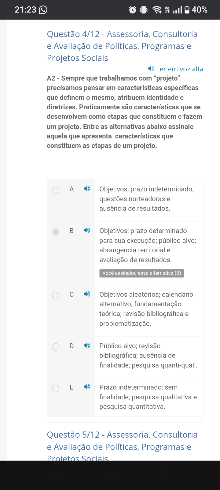 21:23 40% Questão 4/12 Assessoria, Consultoria e Avaliação de Políticas, Programas e Projetos Sociais Ler em voz alta A2 Sempre que trabalhamos com "projeto" precisamos pensar em características específicas que definem mesmo, atribuem identidade e diretrizes. Praticamente são características que se desenvolvem como etapas que constituem e fazem um projeto. Entre as alternativas abaixo assinale aquela que apresenta características que constituem as etapas de um projeto. A Objetivos; prazo indeterminado, questões norteadoras e ausência de resultados. B Objetivos; prazo determinado para sua execução; público alvo; abrangência territorial e avaliação de resultados. Você assinalou essa alternativa (B) Objetivos aleatórios; calendário alternativo; fundamentação teórica; revisão bibliográfica e problematização. D Público alvo; revisão bibliográfica; ausência de finalidade; pesquisa quanti-quali. E Prazo indeterminado; sem finalidade; pesquisa qualitativa e pesquisa quantitativa. Questão 5/12 Assessoria, Consultoria e Avaliação de Políticas, Programas e Sociais