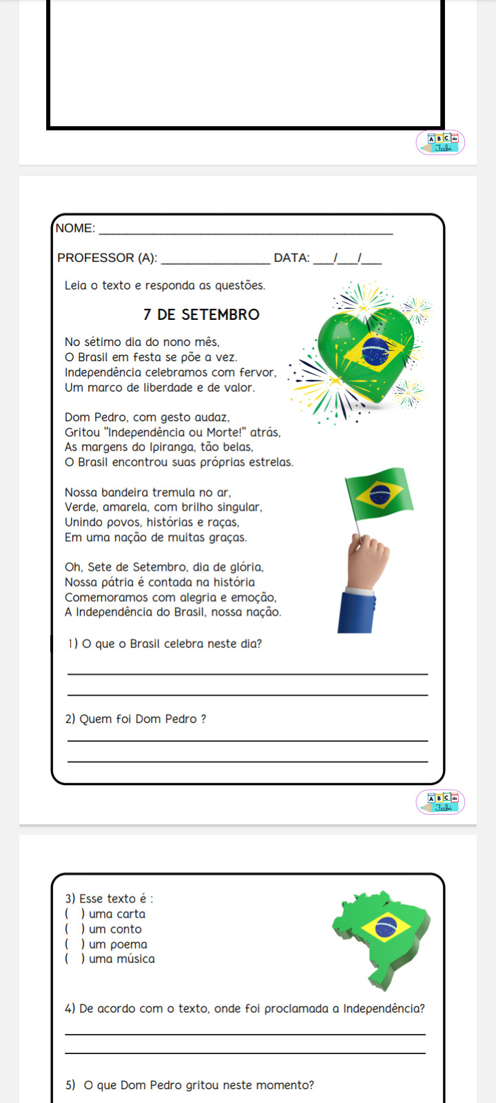 NOME: PROFESSOR (A): DATA: / / Leia O texto e responda as questões. 7 DE SETEMBRO No sétimo dia do nono mês, O Brasil em festa se põe a vez. Independência celebramos com fervor, Um marco de liberdade e de valor. Dom Pedro, com gesto audaz, Gritou "Independência ou Morte!" atrás, As margens do Ipiranga, tão belas, O Brasil encontrou suas próprias estrelas. Nossa bandeira tremula no ar, Verde, amarela, com brilho singular, Unindo povos, histórias e raças, Em uma nação de muitas graças. Oh, Sete de Setembro, dia de glória, Nossa pátria é contada na história Comemoramos com alegria e emoção, A Independência do Brasil, nossa nação. 1) O que O Brasil celebra neste dia? 2) Quem foi Dom Pedro ? Fabi 3) Esse texto é : ( ) uma carta ( ) um conto ( ) um poema 4) De acordo com O texto, onde foi proclamada a Independência? 5) que Dom Pedro gritou neste momento?