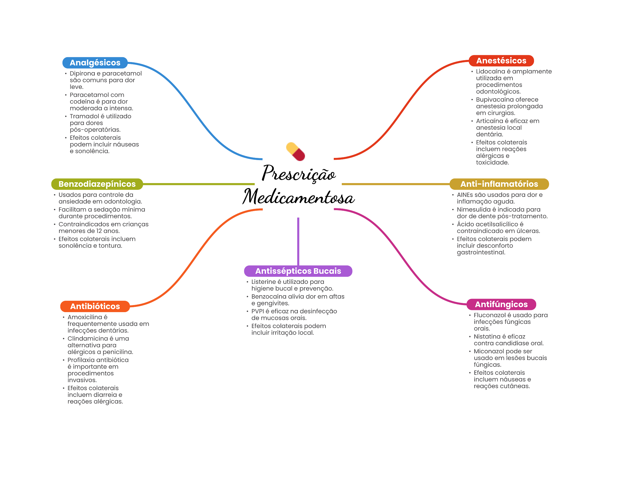 Analgésicos Anestésicos Dipirona é para dor utilizada em procedimentos Paracetamol com odontológicos. para dor oferece moderada a prolongada Tramadol utilizado em cirurgias. para dorse Articatina em anestesia local podem sonolência. alérgicas Benzodiazepínicos Anti-inflamatórios Usados para controle da AINEs são usados para dor e em inflamação aguda. a sedação é para durante procedimentos. dor de dente Contraindicados em crianças Ácido menores de 12 anos. em Efeitos Efeitos colaterais podem sonolência tontura. desconforto gastrointestinal. Antissépticos Bucais Listerine é utilizado para bucal prevenção. alivia dor em aftas Antibióticos gengivites. Antifúngicos PVPI é eficaz na desinfecção de mucosas é usado para frequentemente usada em podem infecções orais. local. é uma Nistatina eficaz alternativa para contra oral. alérgicos a penicilina. Miconazol pode ser antibiótica usado em lesões importante em procedimentos Efeitos náuseas Efeitos outâneas. e reações alérgicas.