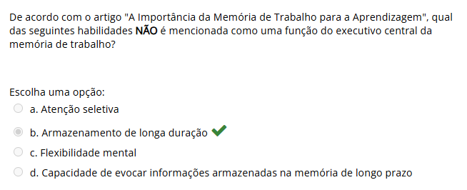 De acordo com 0 artigo "A Importância da Memória de Trabalho para a Aprendizagem", qual das seguintes habilidades NÃO é mencionada como uma função do executivo central da memória de trabalho? Escolha uma opção: a. Atenção seletiva b. Armazenamento de longa duração C. Flexibilidade mental d. Capacidade de evocar informações armazenadas na memória de longo prazo