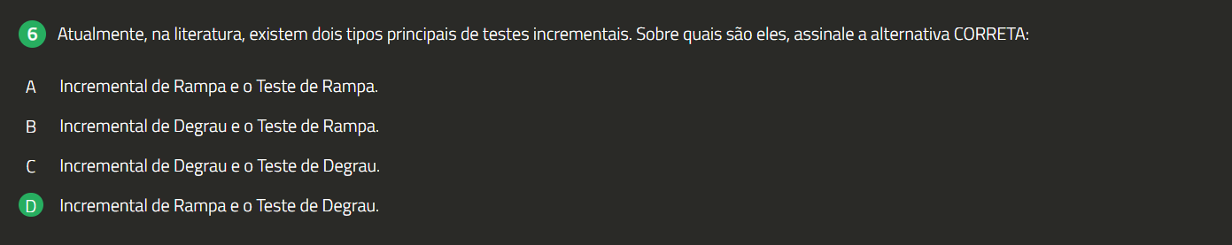 Atualmente, na literatura, existem dois tipos principais de testes incrementais. Sobre quais são eles, assinale a alternativa CORRETA: A Incremental de Rampa e Teste de Degrau. B Incremental de Rampa e Teste de Rampa. C Incremental de Degrau e Teste de Rampa. D Incremental de Degrau e Teste de Degrau.