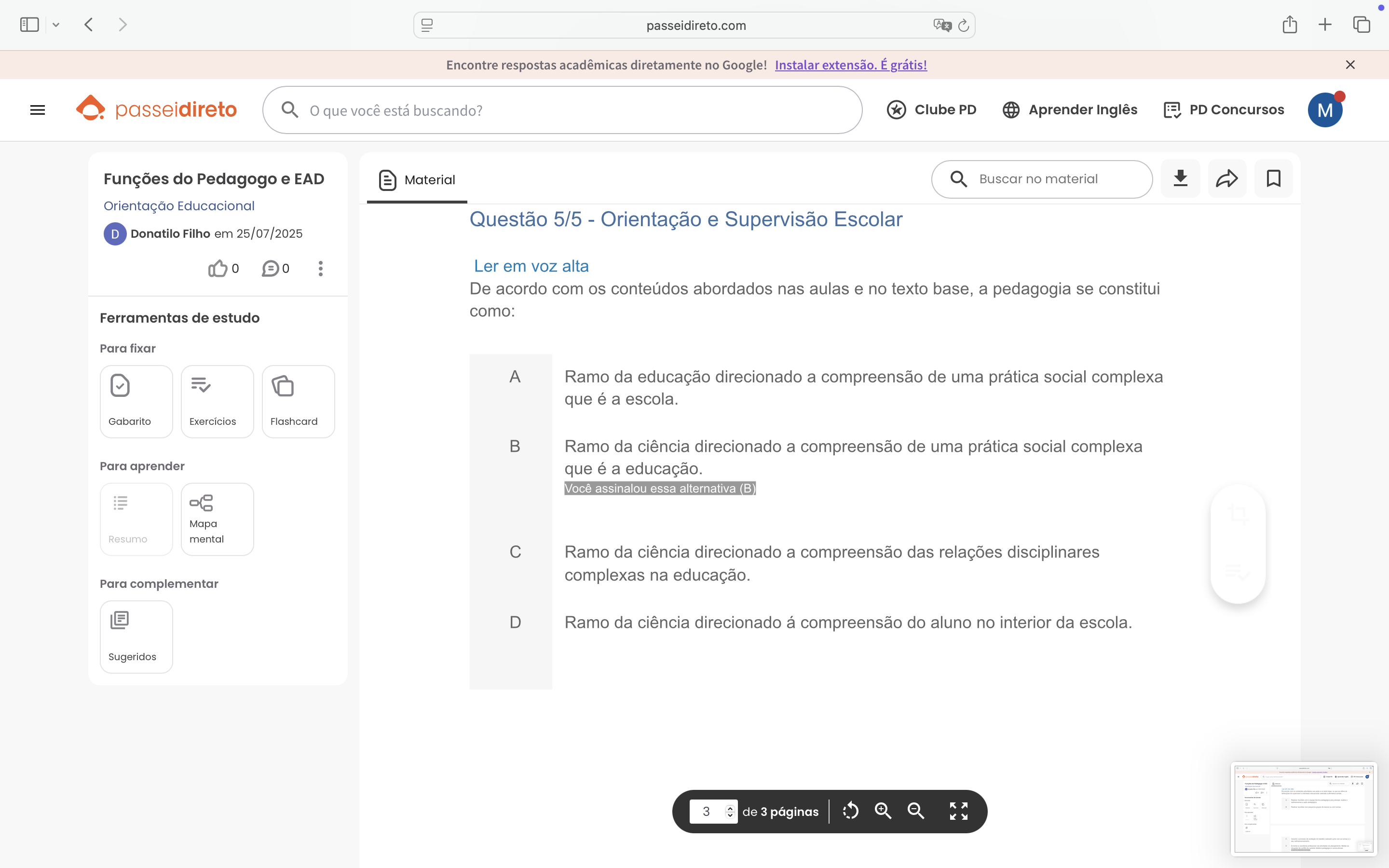 passeidireto.com + Encontre respostas acadêmicas diretamente no Google! Instalar extensão. É grátis! X passeidireto que você está buscando? Clube PD Aprender Inglês PD Concursos M Funções do Pedagogo e EAD Material Buscar no material Orientação Educacional Questão 5/5 Orientação e Supervisão Escolar D Donatilo Filho em 25/07/2025 0 0 Ler em voz alta De acordo com os conteúdos abordados nas aulas e no texto base, a pedagogia se constitui Ferramentas de estudo como: Para fixar A Ramo da educação direcionado a compreensão de uma prática social complexa que é a escola. Gabarito Exercícios Flashcard Ramo da ciência direcionado a compreensão de uma prática social complexa Para aprender que é a educação. Você assinalou essa alternativa (B) Resumo mental c Ramo da ciência direcionado a compreensão das relações disciplinares complexas na educação. Para complementar D Ramo da ciência direcionado á compreensão do aluno no interior da escola. Sugeridos 3 de 3 páginas