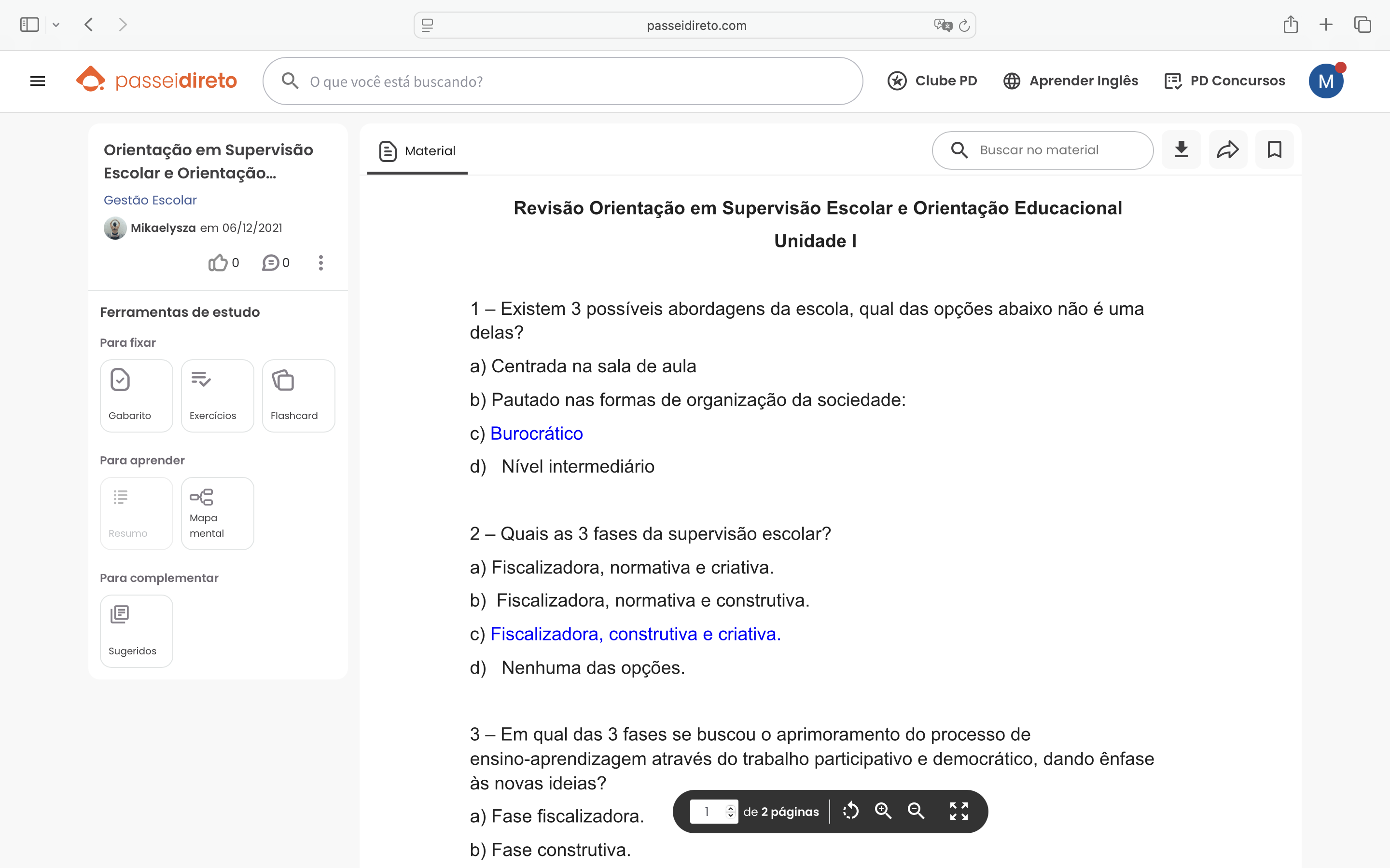 passeidireto.com + passeidireto que você está buscando? Clube PD Aprender Inglês PD Concursos M Orientação em Supervisão Material Buscar no material Escolar e Orientação... Gestão Escolar Revisão Orientação em Supervisão Escolar e Orientação Educacional Mikaelysza em 06/12/2021 Unidade I 0 0 ... Ferramentas de estudo 1 - Existem 3 possíveis abordagens da escola, qual das opções abaixo não é uma delas? Para fixar a) Centrada na sala de aula b) Pautado nas formas de organização da sociedade: Gabarito Exercícios Flashcard c) Burocrático Para aprender d) Nível intermediário Resumo mental 2 - Quais as 3 fases da supervisão escolar? a) Fiscalizadora, normativa e criativa. Para complementar b) Fiscalizadora, normativa e construtiva. c) Fiscalizadora, construtiva e criativa. Sugeridos d) Nenhuma das opções. 3 - Em qual das 3 fases se buscou aprimoramento do processo de ensino-aprendizagem através do trabalho participativo e democrático, dando ênfase às novas ideias? a) Fase fiscalizadora. 1 de 2 páginas b) Fase construtiva.