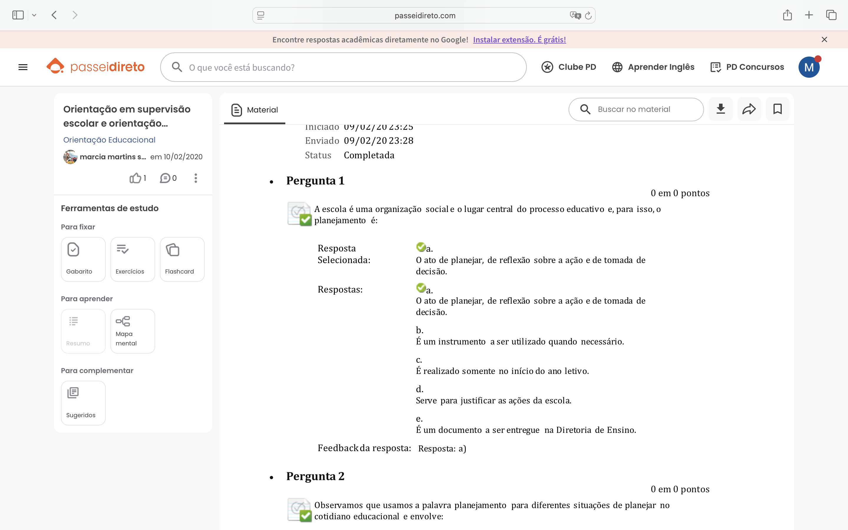 passeidireto.com + Encontre respostas acadêmicas diretamente no Google! Instalar extensão. É grátis! X passeidireto que você está buscando? Clube PD Aprender Inglês PD Concursos M Orientação em supervisão Material Buscar no material escolar e orientação... Iniciado 09/02/2023:25 Orientação Educacional Enviado 09/02/2023:28 marcia martins S... em 10/02/2020 Status Completada 1 0 ... Pergunta 1 0 em 0 pontos Ferramentas de estudo A escola é uma organização social e o lugar central do processo educativo e, para isso, o planejamento é: Para fixar Resposta a. Selecionada: 0 ato de planejar, de reflexão sobre a ação e de tomada de Gabarito Exercícios Flashcard decisão. Respostas: a. Para aprender 0 ato de planejar, de reflexão sobre a ação e de tomada de decisão. b. Resumo mental É um instrumento a ser utilizado quando necessário. C. Para complementar É realizado somente no início do ano letivo. d. Serve para justificar as ações da escola. Sugeridos e. É um documento a ser entregue na Diretoria de Ensino. Feedbackda resposta: Resposta: a) Pergunta 2 0 em 0 pontos Observamos que usamos a palavra planejamento para diferentes situações de planejar no cotidiano educacional e envolve: