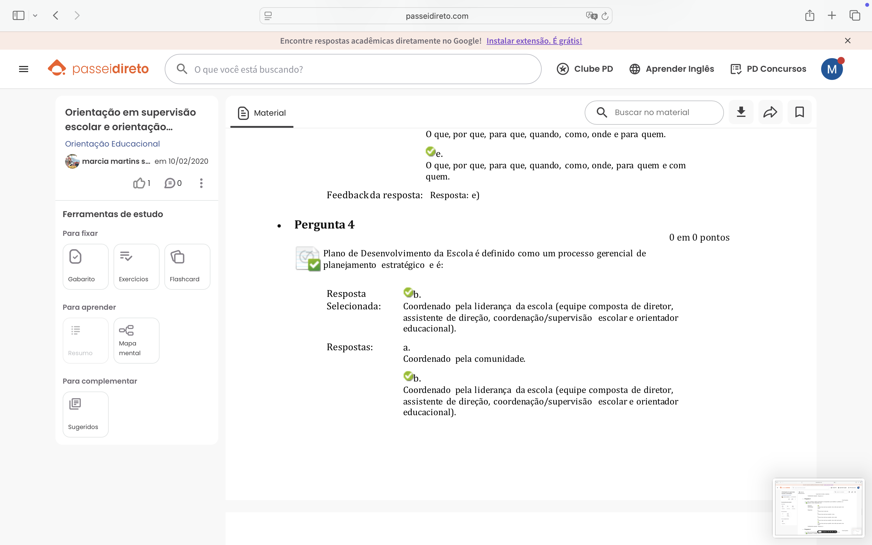 passeidireto.com + Encontre respostas acadêmicas diretamente no Google! Instalar extensão. É grátis! passeidireto que você está buscando? Clube PD Aprender Inglês PD Concursos M Orientação em supervisão Material Buscar no material escolar e orientação... 0 que, por que, para que, quando, como, onde e para quem. Orientação Educacional e. marcia martins S... em 10/02/2020 0 que, por que, para que, quando, como, onde, para quem e com quem. 1 0 ... Feedbackda resposta: Resposta: e) Ferramentas de estudo Pergunta 4 Para fixar 0 em 0 pontos Plano de Desenvolvimento da Escola é definido como um processo gerencial de planejamento estratégico e é: Gabarito Exercícios Flashcard Resposta b. Para aprender Selecionada: Coordenado pela liderança da escola (equipe composta de diretor, assistente de direção, coordenação/supervisão escolar e orientador educacional). Respostas: a. Resumo mental Coordenado pela comunidade. Para complementar b. Coordenado pela liderança da escola (equipe composta de diretor, assistente de direção, coordenação/supervisão escolar e orientador educacional). Sugeridos