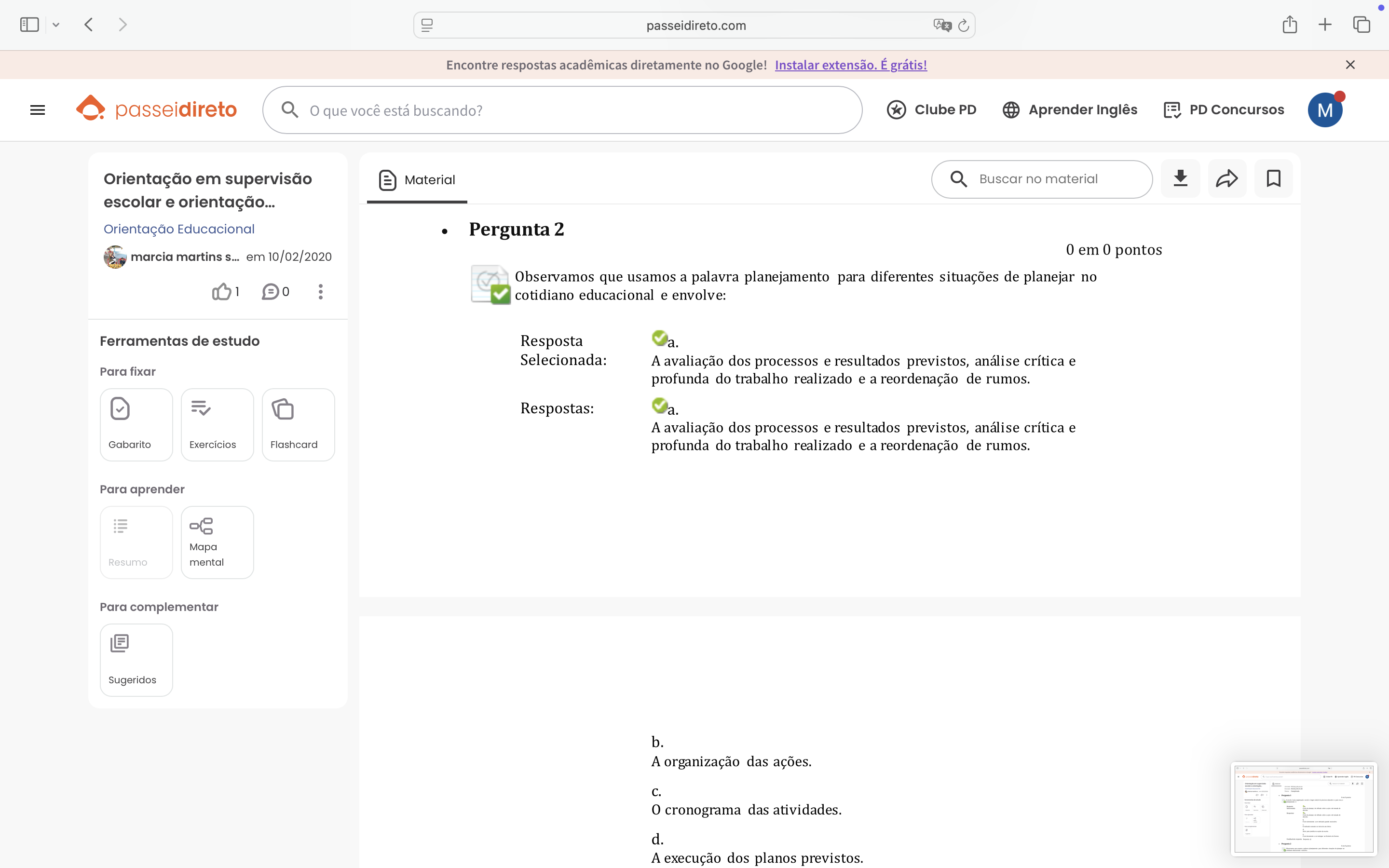 passeidireto.com + Encontre respostas acadêmicas diretamente no Google! Instalar extensão. É grátis! passeidireto que você está buscando? Clube PD Aprender Inglês PD Concursos M Orientação em supervisão Material Buscar no material escolar e orientação... Orientação Educacional Pergunta 2 marcia martins S... em 10/02/2020 0 em 0 pontos Observamos que usamos a palavra planejamento para diferentes situações de planejar no 1 0 cotidiano educacional e envolve: Ferramentas de estudo Resposta a. Selecionada: A avaliação dos processos e resultados previstos, análise crítica e Para fixar profunda do trabalho realizado e a reordenação de rumos. Respostas: a. A avaliação dos processos e resultados previstos, análise crítica e Gabarito Exercícios Flashcard profunda do trabalho realizado e a reordenação de rumos. Para aprender Resumo mental Para complementar Sugeridos b. A organização das ações. 0 cronograma das atividades. d. A execução dos planos previstos.