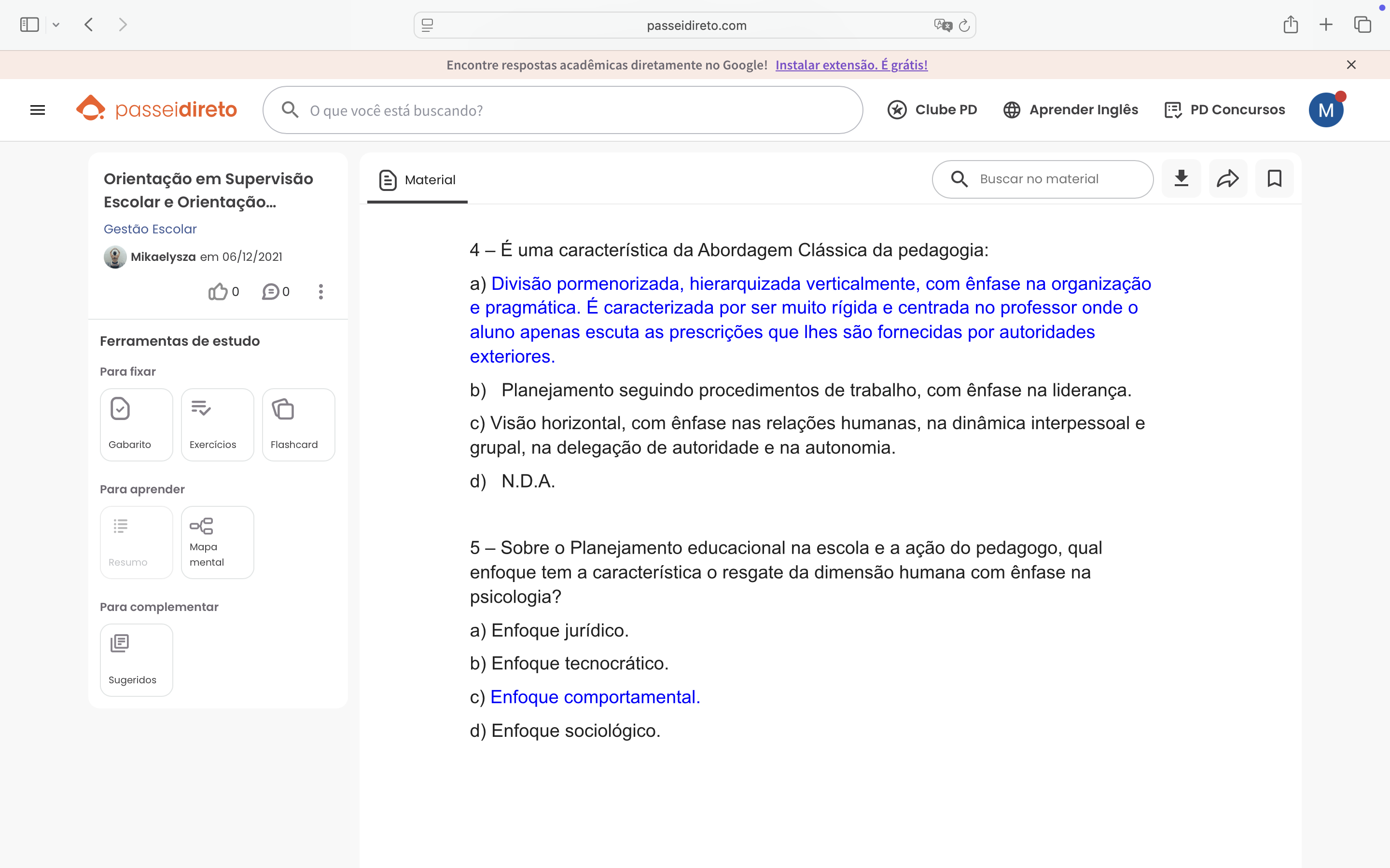 passeidireto.com + Encontre respostas acadêmicas diretamente no Google! Instalar extensão. É grátis! X passeidireto que você está buscando? Clube PD Aprender Inglês PD Concursos M Orientação em Supervisão Material Buscar no material Escolar e Orientação... Gestão Escolar Mikaelysza em 06/12/2021 4 É uma característica da Abordagem Clássica da pedagogia: 0 0 a) Divisão pormenorizada, hierarquizada verticalmente, com ênfase na organização e pragmática. É caracterizada por ser muito rígida e centrada no professor onde Ferramentas de estudo aluno apenas escuta as prescrições que lhes são fornecidas por autoridades exteriores. Para fixar b) Planejamento seguindo procedimentos de trabalho, com ênfase na liderança. c) Visão horizontal, com ênfase nas relações humanas, na dinâmica interpessoal e Gabarito Exercícios Flashcard grupal, na delegação de autoridade e na autonomia. Para aprender d) N.D.A. 5 - Sobre o Planejamento educacional na escola e a ação do pedagogo, qual Resumo mental enfoque tem a característica o resgate da dimensão humana com ênfase na psicologia? Para complementar a) Enfoque jurídico. b) Enfoque tecnocrático. Sugeridos c) Enfoque comportamental. d) Enfoque sociológico.