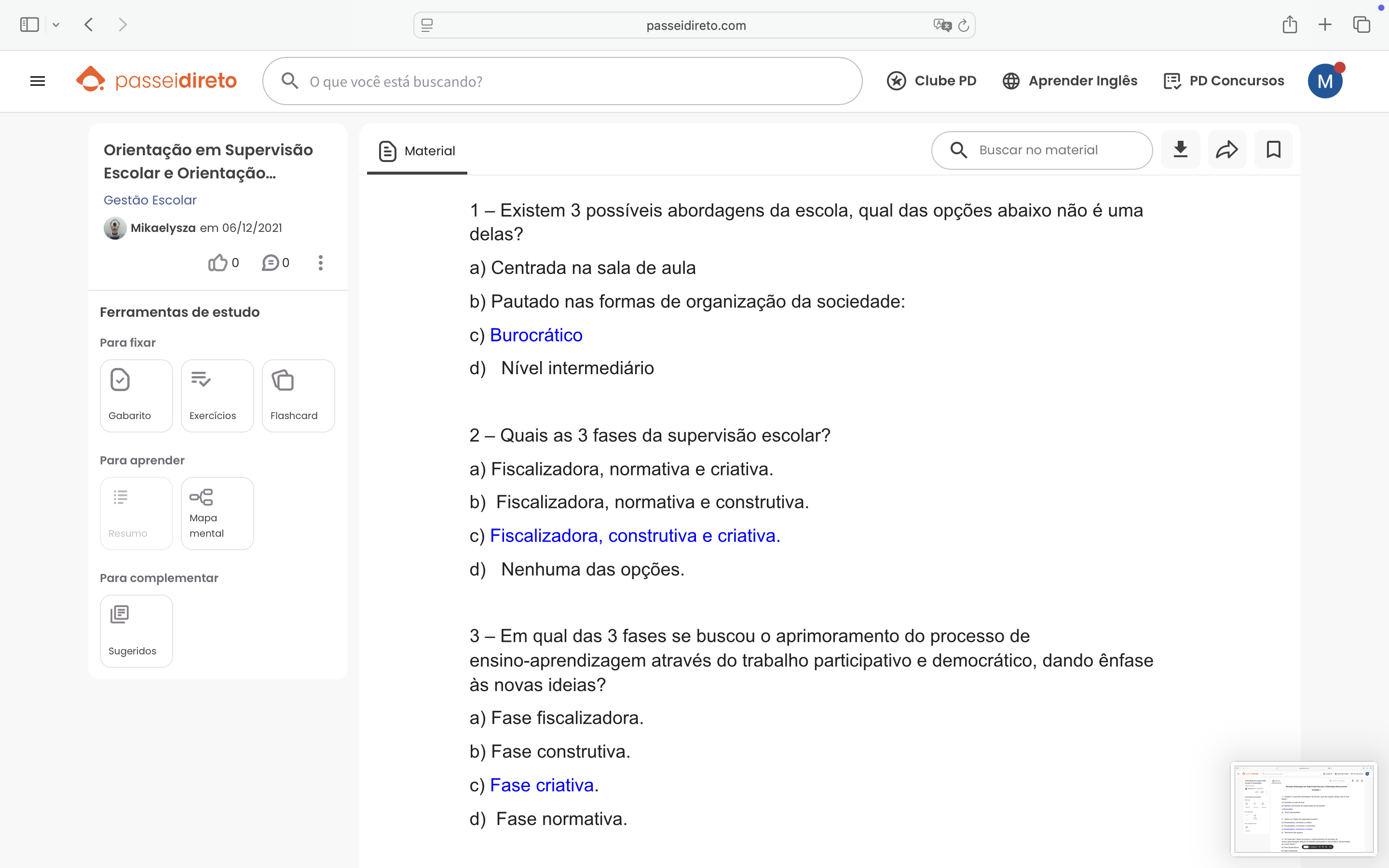 passeidireto.com + passeidireto que você está buscando? Clube PD Aprender Inglês PD Concursos M Orientação em Supervisão Material Buscar no material Escolar e Orientação... Gestão Escolar 1 - Existem 3 possíveis abordagens da escola, qual das opções abaixo não é uma Mikaelysza em 06/12/2021 delas? 0 0 a) Centrada na sala de aula b) Pautado nas formas de organização da sociedade: Ferramentas de estudo Para fixar c) Burocrático d) Nível intermediário Gabarito Exercícios Flashcard 2 - Quais as 3 fases da supervisão escolar? Para aprender a) Fiscalizadora, normativa e criativa. b) Fiscalizadora, normativa e construtiva. Resumo mental c) Fiscalizadora, construtiva e criativa. Para complementar d) Nenhuma das opções. 3 - Em qual das 3 fases se buscou o aprimoramento do processo de Sugeridos ensino-aprendizagem através do trabalho participativo e democrático, dando ênfase às novas ideias? a) Fase fiscalizadora. b) Fase construtiva. c) Fase criativa. d) Fase normativa.