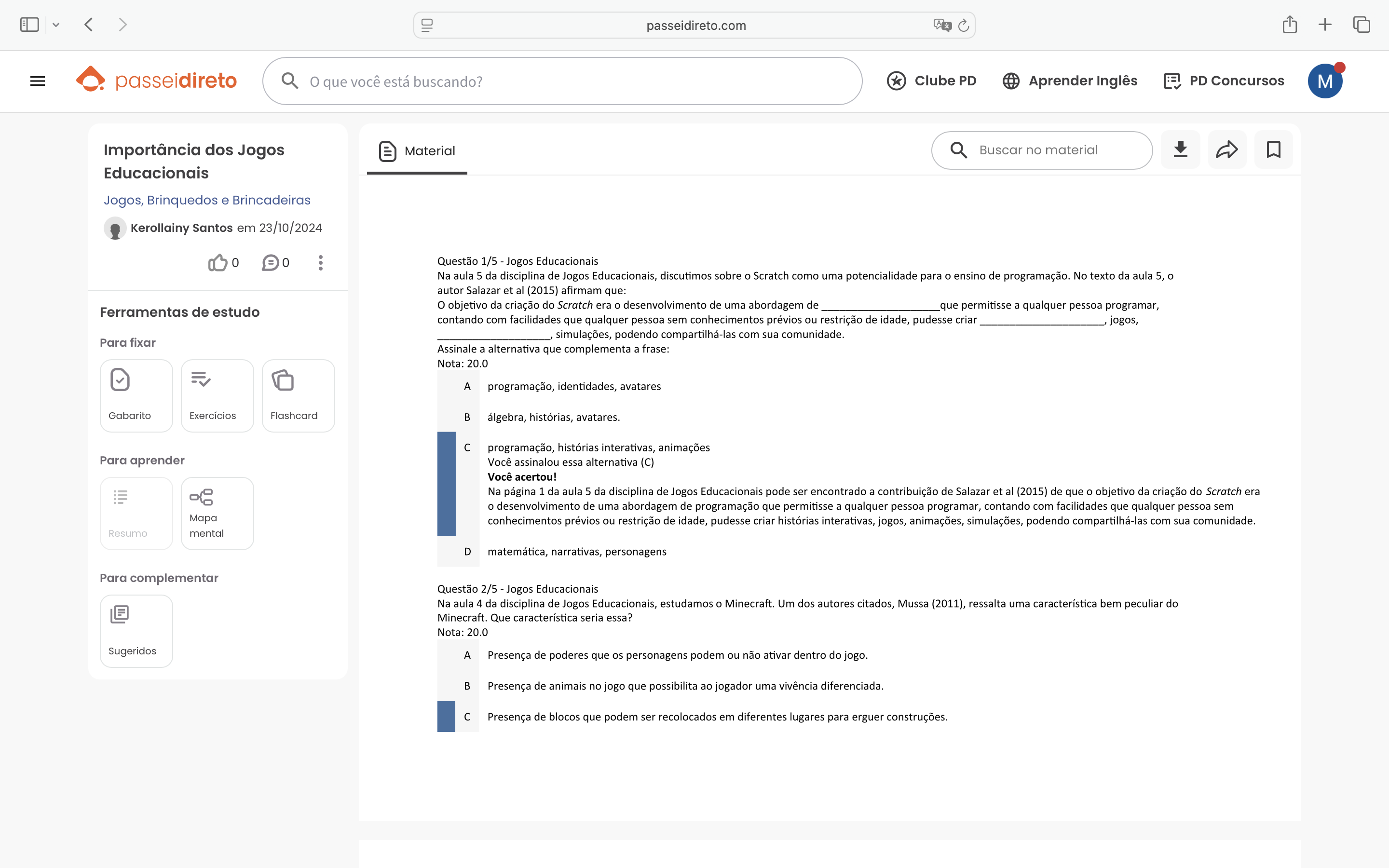 passeidireto.com + passeidireto que você está buscando? Clube PD Aprender Inglês PD Concursos M Importância dos Jogos Material Buscar no material Educacionais Jogos, Brinquedos e Brincadeiras Kerollainy Santos em 23/10/2024 0 0 Questão 1/5 Jogos Educacionais Na aula 5 da disciplina de Jogos Educacionais, discutimos sobre Scratch como uma potencialidade para o ensino de programação. No texto da aula 5, autor Salazar et al (2015) afirmam que: o objetivo da criação do Scratch era desenvolvimento de uma abordagem de Ferramentas de estudo que permitisse a qualquer pessoa programar, contando com facilidades que qualquer pessoa sem conhecimentos prévios ou restrição de idade, pudesse criar jogos, simulações, podendo compartilhá-las com sua comunidade. Para fixar Assinale a alternativa que complementa a frase: Nota: 20.0 A programação, identidades, avatares Gabarito Exercícios Flashcard álgebra, histórias, avatares. c programação, histórias interativas, animações Para aprender Você assinalou essa alternativa (C) Você acertou! Na página 1 da aula 5 da disciplina de Jogos Educacionais pode ser encontrado a contribuição de Salazar et al (2015) de que o objetivo da criação do Scratch era desenvolvimento de uma abordagem de programação que permitisse a qualquer pessoa programar, contando com facilidades que qualquer pessoa sem conhecimentos prévios ou restrição de idade, pudesse criar histórias interativas, jogos, animações, simulações, podendo compartilhá-las com sua comunidade. Resumo mental D matemática, narrativas, personagens Para complementar Questão 2/5 Jogos Educacionais Na aula 4 da disciplina de Jogos Educacionais, estudamos Minecraft. Um dos autores citados, Mussa (2011), ressalta uma característica bem peculiar do Minecraft. Que característica seria essa? Nota: 20.0 Sugeridos A Presença de poderes que os personagens podem ou não ativar dentro do jogo. Presença de animais no jogo que possibilita ao jogador uma vivência diferenciada. Presença de blocos que podem ser recolocados em diferentes lugares para erguer construções.