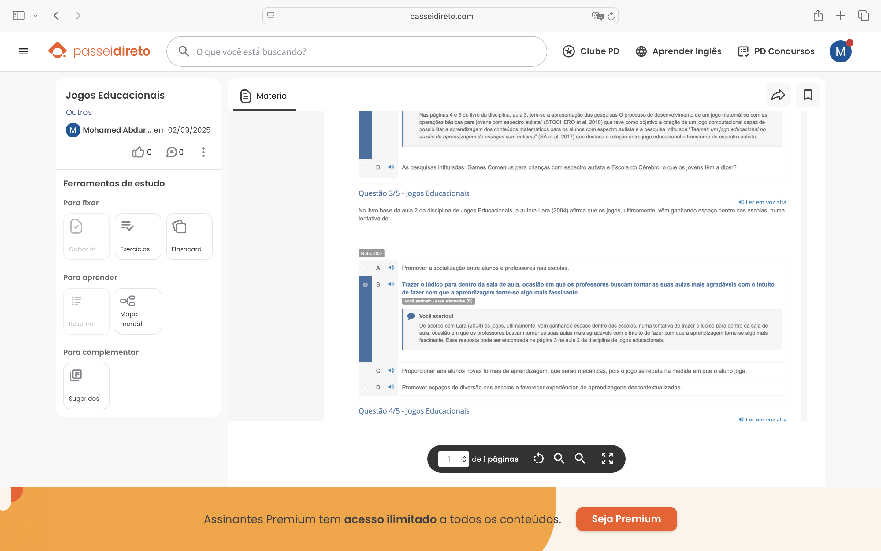 passeidireto.com + passeidireto que você está buscando? Clube PD Aprender Inglês PD Concursos M Jogos Educacionais Material Outros Nas páginas 4 e 5 do livro da disciplina, aula 3, tem-se a apresentação das pesquisas processo de desenvolvimento de um jogo matemático com as operações básicas para jovens com espectro autista" (STOCHERO et al, 2018) que teve como objetivo a criação de um jogo computacional capaz de M Mohamed Abdur... em 02/09/2025 possibilitar a aprendizagem dos conteúdos matemáticos para alunos com espectro autista e a pesquisa intitulada "Teamat: um jogo educacional no auxílio da aprendizagem de crianças com autismo" (SÁ et al, 2017) que destaca a relação entre jogo educacional e transtorno do espectro autista. 0 0 D As pesquisas intituladas: Games Comenius para crianças com espectro autista e Escola do Cérebro: que jovens têm a dizer? Ferramentas de estudo Questão 3/5 Jogos Educacionais Para fixar Ler em voz alta No livro base da aula 2 da disciplina de Jogos Educacionais, a autora Lara (2004) afirma que jogos, ultimamente, vêm ganhando espaço dentro das escolas, numa tentativa de: Gabarito Exercícios Flashcard Nota: 20.0 A Promover a socialização entre alunos e professores nas escolas. Para aprender Trazer lúdico para dentro da sala de aula, ocasião em que os professores buscam tornar as suas aulas mais agradáveis com intuito de fazer com que a aprendizagem torne-se algo mais fascinante. Você assinalou essa alternativa (B) Você acertou! Resumo mental De acordo com Lara (2004) jogos, ultimamente, vêm ganhando espaço dentro das escolas, numa tentativa de trazer lúdico para dentro da sala de aula, ocasião em que professores buscam tornar as suas aulas mais agradáveis com intuito de fazer com que a aprendizagem torne-se algo mais fascinante. Essa resposta pode ser encontrada na página 3 na aula 2 da disciplina de jogos educacionais. Para complementar Proporcionar aos alunos novas formas de aprendizagem, que serão mecânicas, pois jogo se repete na medida em que aluno joga. D Promover espaços de diversão nas escolas e favorecer experiências de aprendizagens descontextualizadas Sugeridos Questão 4/5 Jogos Educacionais er em alta 1 de páginas + Assinantes Premium tem acesso ilimitado a todos conteúdos. Seja Premium