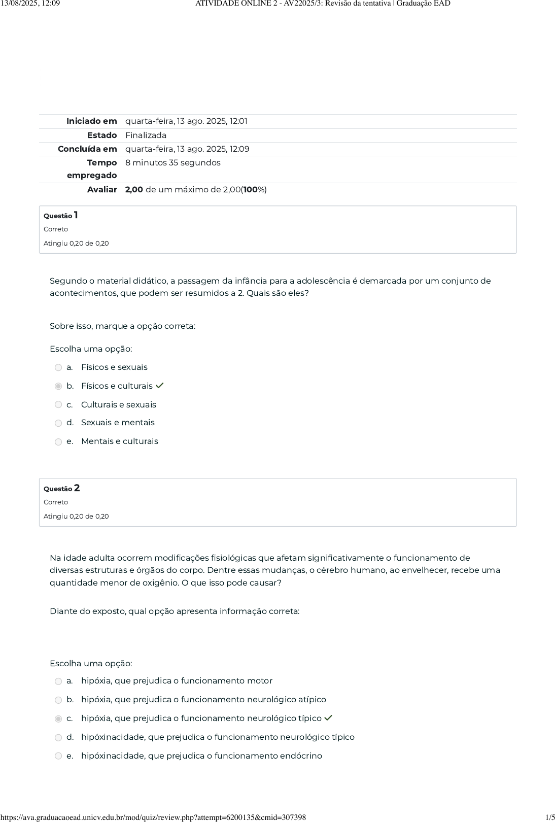 Iniciado em quarta-feira, 13 ago. 2025, 12:01 Estado Finalizada Concluída em quarta-feira, 13 ago. 2025, 12:09 Tempo empregado 8 minutos 35 segundos Avaliar 2,00 de um máximo de 2,00(100%) Questão 1 Correto Atingiu 0,20 de 0,20 Questão 2 Correto Atingiu 0,20 de 0,20 Segundo o material didático, a passagem da infância para a adolescência é demarcada por um conjunto de acontecimentos, que podem ser resumidos a 2. Quais são eles? Sobre isso, marque a opção correta: Escolha uma opção: a. Físicos e sexuais b. Físicos e culturais ✓ c. Culturais e sexuais d. Sexuais e mentais e. Mentais e culturais Na idade adulta ocorrem modificações fisiológicas que afetam significativamente o funcionamento de diversas estruturas e órgãos do corpo. Dentre essas mudanças, o cérebro humano, ao envelhecer, recebe uma quantidade menor de oxigênio. O que isso pode causar? Diante do exposto, qual opção apresenta informação correta: Escolha uma opção: a. hipóxia, que prejudica o funcionamento motor b. hipóxia, que prejudica o funcionamento neurológico atípico c. hipóxia, que prejudica o funcionamento neurológico típico ✓ d. hipóxinacidade, que prejudica o funcionamento neurológico típico e. hipóxinacidade, que prejudica o funcionamento endócrino 13/08/2025, 12:09 ATIVIDADE ONLINE 2 - AV22025/3: Revisão da tentativa | Graduação EAD https://ava.graduacaoead.unicv.edu.br/mod/quiz/review.php?attempt=6200135&cmid=307398 1/5 Questão 3 Correto Atingiu 0,20 de 0,20 Questão 4 Correto Atingiu 0,20 de 0,20 Questão 5 Correto Atingiu 0,20 de 0,20 As principais características de desenvolvimento podem ser separadas por domínio: motor, cognitivo e afetivo. Em qual domínio a criança apresenta Imaginação fantasiosa que permite imitar ações e símbolos? A esse respeito, qual é a resposta correta? Escolha uma opção: a. Afetivo b. Maturacional c. Cognitivo ✓ d. Fase pré-fálica e. Motor A sigla HMFs é um conjunto que a criança entre 2 e 7 anos de idade desenvolve, devido à exposição intensa a múltiplas experimentações e vivências. Qual o significado da sigla HMFs? Assinale a alternativa correta. Escolha uma opção: a. Habilidades motoras fundamentais ✓ b. Habilidades motoras e físicas c. Horário motor físico d. Habilidades mentais e fisiológicas e. Habilidades mentais fundamentais Analise as opções a seguir e assinale a alternativa que possui apenas terminologias corretas para se referir ao período conhecido popularmente como “idade adulta”. Escolha uma opção: a. adulty, adultescência, andragogia, adultidade b. adultez, adultescência, andragogia, adultologia c. adultez, adultescência, andragogia, adultidade ✓ d. adultez, adultenia, andragogia, adultidade e. adultezine, adultescência, andragogia, adultidade 13/08/2025, 12:09 ATIVIDADE ONLINE 2 - AV22025/3: Revisão da tentativa | Graduação EAD https://ava.graduacaoead.unicv.edu.br/mod/quiz/review.php?attempt=6200135&cmid=307398 2/5 Questão 6 Correto Atingiu 0,20 de 0,20 Questão 7 Correto Atingiu 0,20 de 0,20 O sistema musculoesquelético tem diversas funções e acaba sofrendo algumas alterações naturais com o envelhecimento. Sobre isso, analise os itens a seguir. 1) Redução de estatura. 2) As mulheres podem perder 10 cm. 3) Com a osteoporose ocorrem mudanças esqueléticas. Observando as afirmações acima, escolha a alternativa abaixo que apresenta os itens corretos. Escolha uma opção: a. Apenas o item 3 b. Os itens 1 e 3 ✓ c. Os itens 1, 2 e 3 d. Apenas o item 1 e. Apenas os itens 1 e 2 Segundo Gallahue e Ozmun (2013), “À medida que ficam velhos, os adultos precisam de interação com outras pessoas e atividade física continuada para ficarem felizes e satisfeitos”. Os autores estão se referindo a qual teoria? Sobre isso, qual alternativa apresenta informações corretas? Escolha uma opção: a. Teoria comportamental b. Teoria da Atividade ✓ c. Teoria psicomotora d. Teoria do Desengajamento e. Teoria cognitiva 13/08/2025, 12:09 ATIVIDADE ONLINE 2 - AV22025/3: Revisão da tentativa | Graduação EAD https://ava.graduacaoead.unicv.edu.br/mod/quiz/review.php?attempt=6200135&cmid=307398 3/5 Questão 8 Correto Atingiu 0,20 de 0,20 Questão 9 Correto Atingiu 0,20 de 0,20 A expectativa de vida da população tem aumentado década após década, com base em pesquisas e dados fornecidos pelo Instituto Brasileiro de Geografia e Estatística (IBGE). Quais fatores influenciam nesse aumento da expectativa de vida? Sobre isso, marque a opção correta: Escolha uma opção: a. melhoria na qualidade de vida, a prevenção de doenças, condições de saneamento básico, o surgimento de vacinas ✓ b. melhoria na qualidade de moradia, a prevenção de doenças letais, condições de saneamento básico, o banimento de vacinas c. melhoria na qualidade de vida, a não prevenção de doenças, condições de saneamento básico, o surgimento de antidepressivos d. melhoria na qualidade do transporte urbano, a prevenção de doenças, boas condições de trabalho, o banimento de vacinas e. melhoria na qualidade de vida, a prevenção de doenças sexualmente transmissíveis, o banimento de vacinas Leia o excerto a seguir: “Adultos jovens e os de meia-idade não sofrem grandes prejuízos na execução dessas tarefas, pois estão relacionadas às ações motoras cotidianas, como escovar os dentes, levantar-se da cama, trocar de roupas, tomar banho, entre outras”. O excerto apresentado está se referindo a qual conceito? Marque a opção correta: Escolha uma opção: a. tempo de reação b. atividades da vida diária ✓ c. equilíbrio e controle postural d. marcha e. tempo de ação 13/08/2025, 12:09 ATIVIDADE ONLINE 2 - AV22025/3: Revisão da tentativa | Graduação EAD https://ava.graduacaoead.unicv.edu.br/mod/quiz/review.php?attempt=6200135&cmid=307398 4/5 Questão 10 Correto Atingiu 0,20 de 0,20 Assim como nas outras fases do desenvolvimento humano, é necessário olhar para as particulari