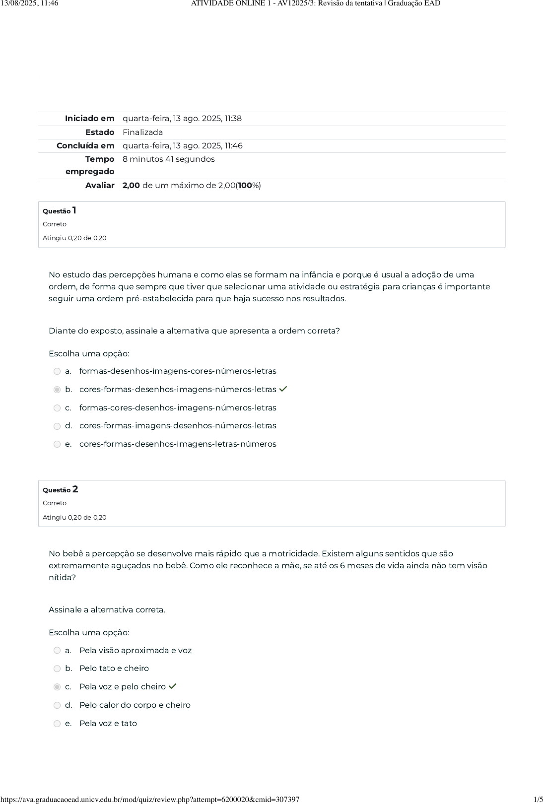 Iniciado em quarta-feira, 13 ago. 2025, 11:38 Estado Finalizada Concluída em quarta-feira, 13 ago. 2025, 11:46 Tempo empregado 8 minutos 41 segundos Avaliar 2,00 de um máximo de 2,00(100%) Questão 1 Correto Atingiu 0,20 de 0,20 Questão 2 Correto Atingiu 0,20 de 0,20 No estudo das percepções humana e como elas se formam na infância e porque é usual a adoção de uma ordem, de forma que sempre que tiver que selecionar uma atividade ou estratégia para crianças é importante seguir uma ordem pré-estabelecida para que haja sucesso nos resultados. Diante do exposto, assinale a alternativa que apresenta a ordem correta? Escolha uma opção: a. formas-desenhos-imagens-cores-números-letras b. cores-formas-desenhos-imagens-números-letras ✓ c. formas-cores-desenhos-imagens-números-letras d. cores-formas-imagens-desenhos-números-letras e. cores-formas-desenhos-imagens-letras-números No bebê a percepção se desenvolve mais rápido que a motricidade. Existem alguns sentidos que são extremamente aguçados no bebê. Como ele reconhece a mãe, se até os 6 meses de vida ainda não tem visão nítida? Assinale a alternativa correta. Escolha uma opção: a. Pela visão aproximada e voz b. Pelo tato e cheiro c. Pela voz e pelo cheiro ✓ d. Pelo calor do corpo e cheiro e. Pela voz e tato 13/08/2025, 11:46 ATIVIDADE ONLINE 1 - AV12025/3: Revisão da tentativa | Graduação EAD https://ava.graduacaoead.unicv.edu.br/mod/quiz/review.php?attempt=6200020&cmid=307397 1/5 Questão 3 Correto Atingiu 0,20 de 0,20 Questão 4 Correto Atingiu 0,20 de 0,20 Leia e analise o texto a seguir: O Reflexo ________________________ é quando o bebê é colocado na posição ereta sob uma superfície plana e ele “anda”, faz a troca da passada, como se estivesse andando. Qual opção se encaixa corretamente no espaço? Qual opção apresenta informações que se encaixam corretamente à lacuna do texto? Escolha uma opção: a. de engatinhar b. primário de marcha automática ✓ c. de paraquedas e de extensão d. de endireitamento do pescoço e do corpo e. de endireitamento labiríntico e óptico Após a segunda guerra mundial surgiram novos estudos sobre o desenvolvimento motor, por pesquisadores da área da Educação Física que trabalharam com as potencialidades da performance motora em crianças. Diferente de Gesell e McGraw, que trabalharam mais com bebês, Espenschade, Glassow e Rarick (1981) concentraram suas investigações em qual população? Assinale a alternativa correta. Escolha uma opção: a. Em crianças de até 5 anos b. Em crianças de até 3 anos c. Em crianças em idade escolar ✓ d. Em crianças que estão desenvolvendo a coordenação motora fina e. Em crianças que estão desenvolvendo a fala 13/08/2025, 11:46 ATIVIDADE ONLINE 1 - AV12025/3: Revisão da tentativa | Graduação EAD https://ava.graduacaoead.unicv.edu.br/mod/quiz/review.php?attempt=6200020&cmid=307397 2/5 Questão 5 Correto Atingiu 0,20 de 0,20 Questão 6 Correto Atingiu 0,20 de 0,20 Os recém-nascidos parecem se movimentar de maneira aleatória e somente em uma direção. Realizam movimentos espontâneos que aparentemente parecem não ter sido estimulados. Em outras situações parecem executar um movimento específico quando são tocados em determinada parte do corpo, como, por exemplo, quando tocamos a palma da mão do bebê e ele responde fechando os dedos, como se segurasse o nosso dedo. Como são chamados esses movimentos? Sobre isso, marque a opção correta: Escolha uma opção: a. Mobilidade b. Intuição c. Motoridade d. Reflexos ✓ e. Movimentação A Ampulheta triangulada proposta por Gallahue e Ozmun fornece a visão descritiva de desenvolvimento humano, mostrando as fases típicas e os estágios de movimentos de acordo com a faixa etária, do nascimento até a velhice. Quais são as fases dos movimentos apresentados pelos autores? Assinale a alternativa correta. Escolha uma opção: a. Reflexo, rudimentar, Individual, e motoras b. Reflexo, ambiental, tarefas físicas e de aprendizagem c. Ambiental, rudimentar, fundamental e especializado d. Reflexo, rudimentar, fundamental e especializado ✓ e. Tarefas motoras e de aprendizagem, rudimentar e fundamental 13/08/2025, 11:46 ATIVIDADE ONLINE 1 - AV12025/3: Revisão da tentativa | Graduação EAD https://ava.graduacaoead.unicv.edu.br/mod/quiz/review.php?attempt=6200020&cmid=307397 3/5 Questão 7 Correto Atingiu 0,20 de 0,20 Questão 8 Correto Atingiu 0,20 de 0,20 Os primeiros estudos que tematizam o desenvolvimento motor partiram do princípio da maturação e foram encabeçados por Arnold Gesell (1928) e Myrtle McGraw (1935). Qual ideia os pesquisadores defendiam? Assinale a alternativa correta. Escolha uma opção: a. “O desenvolvimento é função de processos biológicos inatos, que resultam em uma sequência universal de aquisição das habilidades de movimento pelo bebê” ✓ b. “O desenvolvimento é função de processos químicos inatos, que resultam em uma sequência universal de aquisição das habilidades de fala pelo bebê” c. “O desenvolvimento é função de processos físicos inatos, que resultam em uma sequência universal de aquisição das habilidades de pensamento pelo bebê” d. “O desenvolvimento é função de processos biológicos natos, que resultam em uma sequência universal de aquisição das habilidades de fala pelo bebê” e. “O desenvolvimento é função de processos biológicos inatos, que resultam em uma sequência individual de aquisição das habilidades de movimento pela criança até 2 anos” De acordo com os estudos disponibilizados no seu material de estudo, leia e complete a lacuna da afirmação abaixo: A ____________________ é entendida como o conjunto de adequações e ajustes da resposta a partir de uma vivência, que envolve estruturas de tomada de decisão superiores. Assinale a alternativa que apresenta o termo/conceito que completa corretamente a lacuna do texto. Escolha uma opção: a. Matura