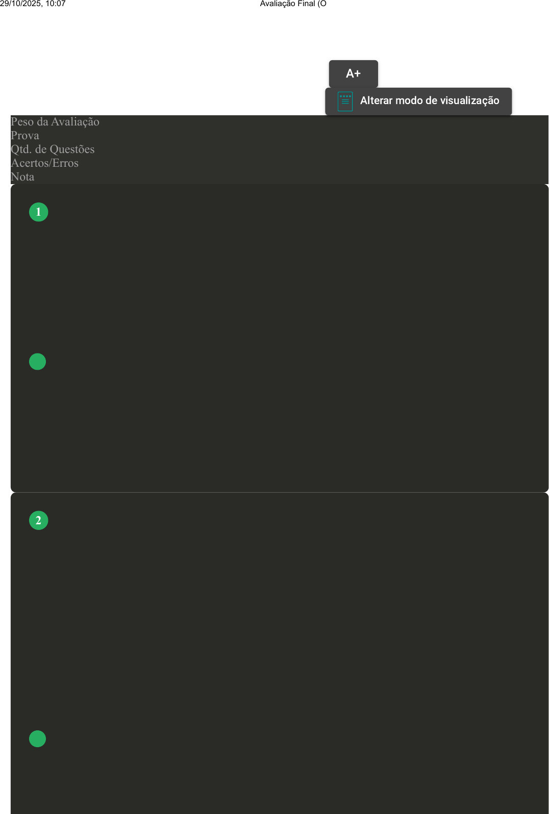 Prova Impressa GABARITO | Avaliação Final (Objetiva) - Individual (Cod.:1523662) Peso da Avaliação 4,00 Prova 104604846 Qtd. de Questões 10 Acertos/Erros 9/1 Nota 9,00 A artrite reumatoide é uma doença inflamatória, autoimune sistêmica que ocorre principalmente na membrana sinovial. Dentre as manifestações clínicas, analise as sentenças a seguir: I- O ataque à membrana sinovial desencadeia um processo inflamatório local e persistente formando uma estrutura denominada pannus. II- Apesar do processo inflamatório grave não ocorre prejuízo funcional às articulações lesionadas. III- Condições clínicas extra articulares podem ocorrer incluindo ulceração nos membros inferiores, derrames pleurais ou pericárdicos e síndrome de Felty e de Sjögren. Assinale a alternativa CORRETA: A As sentenças I e III estão corretas. B Somente a sentença II está correta. C Somente a sentença III está correta. D As sentenças I e II estão corretas. O HIV é um vírus que infecta o sistema imunológico dos seres humanos. Se não tratada passa a expressar um quadro conhecido como Síndrome da Imunodeficiência Adquirida (SIDA ou AIDS). Sobre as fases de progressão da doença, associe os itens, utilizando o código a seguir: I- Infecção aguda II- Latência clínica III- Síndrome da Imunodeficiência Adquirida. ( ) Um paciente é enquadrado nesta fase quando a contagem de linfócitos T-CD4+ é inferior a 200 células/mm3. ( ) Esta fase dura de 3 a 6 semanas, e por apresentar sintomas leves e similares ao de uma gripe. ( ) Nesta fase, o vírus se replica intensamente, porém o sistema imune por ainda consegue controlar a replicação viral, de modo que o paciente não manifesta sintomas. Assinale a alternativa que apresenta a sequência CORRETA: A III - I - II. B II - I - III. C I - II - III. VOLTAR A+ Alterar modo de visualização 1 2 29/10/2025, 10:07 Avaliação Final (Objetiva) - Individual about:blank 1/5 D I - III - II. M.S., sexo masculino, 26 anos, foi admitido no pronto-socorro relatando surgimento de lesões de base endurecida e secreção na região da glande. Com base em qual doença que essa lesão é característica, assinale a alternativa CORRETA: A Sífilis secundária. B Sífilis primária. C Sífilis congênita. D Neurosifilis. A imunocromatografia faz parte da rotina laboratorial pois trata de uma metodologia qualitativa, utilizada como triagem para identificar os mais diferentes tipos de substâncias. Com base nessa técnica, analise as sentenças a seguir: I- Esta técnica é realizada utilizando uma matriz, que é o local onde ocorrerá a reação. II- Podemos identificar tanto antígeno quanto anticorpos presentes na amostra. III- Existem diferentes aplicações sendo elas de fluxo único, duplo percurso e imunoconcentração. Assinale a alternativa CORRETA: A As sentenças I e II estão corretas. B As sentenças I e III estão corretas. C Somente a sentença I está correta. D Somente a sentença III está correta. A nefelometria é uma técnica quantitativa utilizada para mensurar a concentração dos imunocoplexos presentes na amostra. Com base no exposto, avalie as asserções a seguir e a relação proposta entre elas: I- O nefelômetro mensura a luz dispersa pelos imunocomplexos pois possui em sua estrutura um detector, posicionado em um ângulo de 70° em relação a fonte de luz. PORQUE II- A mensuração é realiza na leitura da absorbância presente na reação entre amostra e reagente. Assinale a alternativa CORRETA: A As asserções I e II são proposições falsas. 3 4 5 29/10/2025, 10:07 Avaliação Final (Objetiva) - Individual about:blank 2/5 B A asserção I é uma proposição verdadeira, e a II é uma proposição falsa. C As asserções I e II são proposições verdadeiras, mas a II não é uma justificativa da I. D As asserções I e II são proposições verdadeiras, e a II é uma justificativa da I. Os ensaios imunoenzimáticos de micropartículas se diferenciam do ELISA pois a porção sólida são micropartículas em suspensão líquida. Com base nos princípios do teste, analise as sentenças a seguir: I- Nessa técnica, a fase sólida são micropartículas de látex que contém o antígeno. II- A reação ocorre devido à florescência gerada pela reação, que é mensurada. III- Assim como no ELISA, existem variações da técnica a ser empregadas no laboratório. Assinale a alternativa CORRETA: A Somente a sentença I está correta. B As sentenças I e II estão corretas. C As sentenças I e III estão corretas. D Somente a sentença II está correta. O antígeno e os anticorpos utilizados para diagnóstico de hepatite B permitem compreender qual o estágio da infecção. Com base no exposto, associe os itens, utilizando o código a seguir: I- Paciente com o esquema vacinal completo para hepatite B II- Paciente com imunidade infecção passada recente de Hepatite B. III- Paciente com infecção de Hepatite B aguda. ( ) Um paciente de 25 anos apresenta os seguintes exames: Anti-HBs positivo anti-HBc (IgG e IgM) positivo e HBsAg positivo. ( ) Um paciente de 20 anos apresenta os seguintes exames: Anti-HBs negativo, anti-HBc (IgG e IgM) positivo, HBeAg positivo, e HBsAg positivo. ( ) Um paciente de 40 anos apresenta os seguintes exames: Anti-HBs positivo, anti-HBc negativo e HBsAg negativo. Assinale a alternativa que apresenta a sequência CORRETA: A III - II - I. B I - II - III. C II - III - I. 6 Revisar Conteúdo do Livro 7 29/10/2025, 10:07 Avaliação Final (Objetiva) - Individual about:blank 3/5 D II - I - III. A sífilis é uma doença crônica, exclusiva do ser humano, infectocontagiosa, transmitida predominantemente por via sexual, que também pode ser transmitida verticalmente durante a gestação. Quando ocorre a transmissão da sífilis da mãe para a criança, denomina-se sífilis congênita. A respeito dos imunodiagnósticos utilizados para triagem e diagnóstico da sífilis, analise as sentenças a seguir: I- Para se 