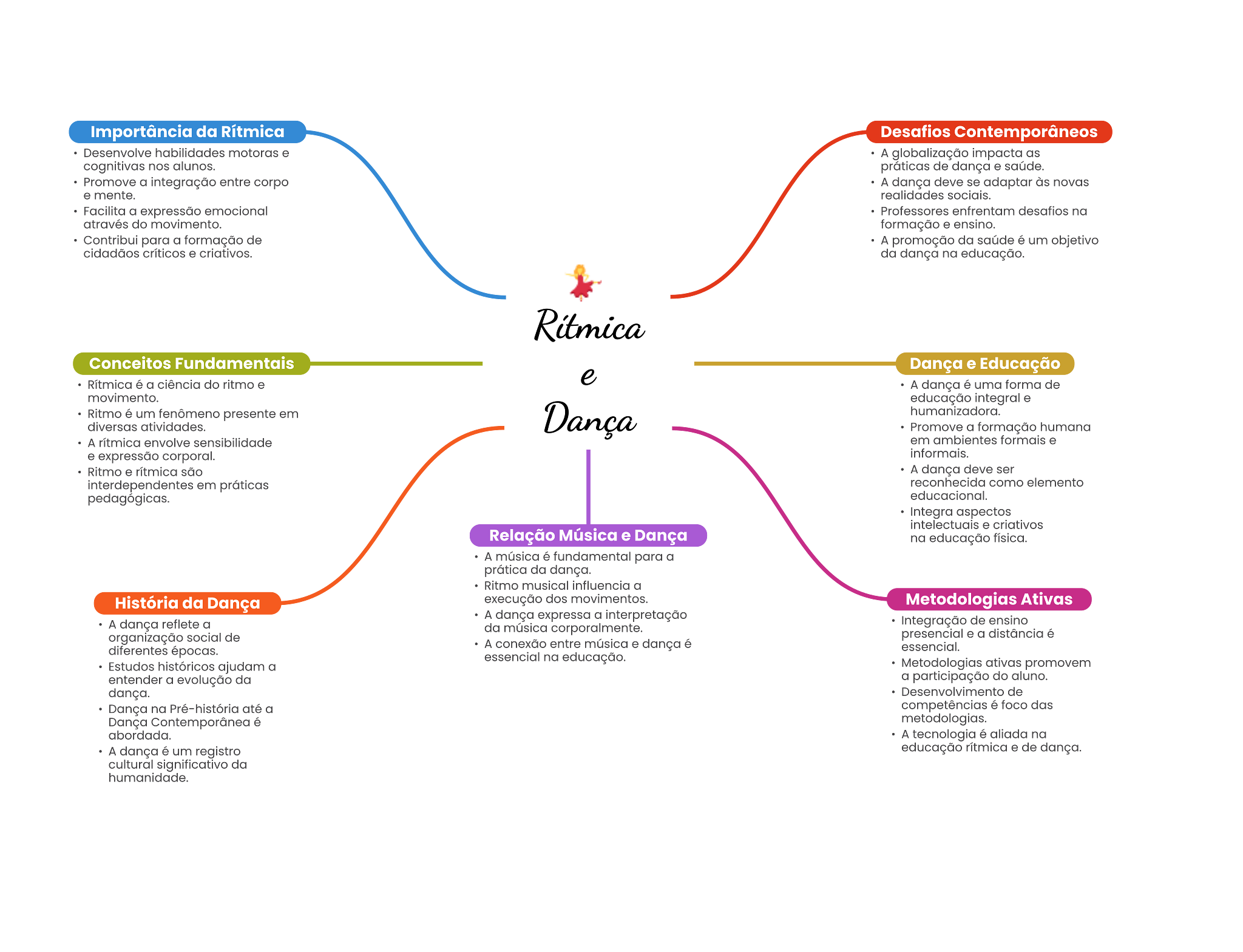 Importância da Rítmica Desafios Contemporâneos Desenvolve motoras A impacta nos alunos. de dança . Promove a entre corpo A dança deve às . ments. socials. Facilita a emocional Professores na do movimento. formação ensino. Contribui para a formação de A promoção da saúde um objetivo da dança na educação. Conceitos Fundamentais Dança e Educação Ritmica é a ciência do ritmo A dança uma forma de movimento. educação integral Ritmo 6 um fenômeno presente em diversas atividades. Promove a formação humana A sensibilidade em ambientes expressão corporal. Ritmo rítmica são A dança deve ser Interdependentes em práticas como elemento pedagógicas. educacional. Integra aspectos criativos Relação Música e Dança na educação fisica. A música é fundamental para a da dança. Ritmo musical a História da Dança execução dos movimentos. Metodologias Ativas A dança expressa a A dança reflete a da música corporalmente. de organização social de presencial a diferentes A entre música dança é essencial. na educação. Estudos históricos ajudam a Metodologias ativas promovem entender a evolução da a participação do aluno. dança. de Dança na até a é foco das Dança abordada. A tecnologia aliada na A dança um registro educação de cultural significativo da humanidade.