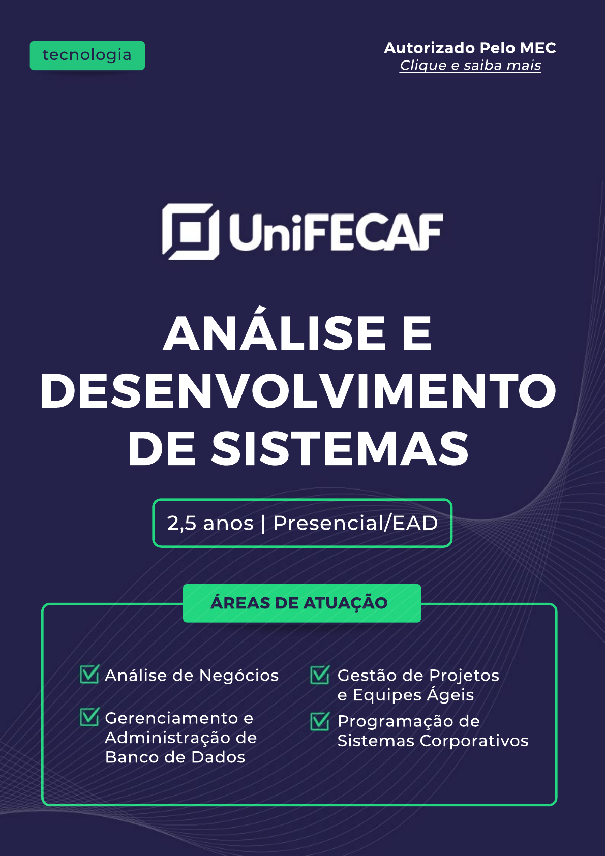 ANÁLISE E DESENVOLVIMENTO DE SISTEMAS 2,5 anos | Presencial/EAD Gerenciamento e Administração de Banco de Dados Gestão de Projetos e Equipes Ágeis Programação de Sistemas Corporativos Análise de Negócios tecnologia ÁREAS DE ATUAÇÃO https://emec.mec.gov.br/emec/consulta-cadastro/detalhamento/d96957f455f6405d14c6542552b0f6eb/MTc4NTQ=/c1b85ea4d704f246bcced664fdaeddb6/QU7BTElTRSBFIERFU0VOVk9MVklNRU5UTyBERSBTSVNURU1BUw== POR QUE ESTUDAR NA UniFECAF osvaldo.silva@fecaf.com.br OSVALDO SILVA JR. ANÁLISE E DESENV. DE SISTEMAS Mestre em Educação Matemática, especialista em Gestão da Tecnologia da Informação e Gestão Ágil, formado em Administração com Hab. em Siste- mas de Informação pela FIAP. Mais de 25 anos de experiência no mercado corporativo, professor universitário desde 2007 e atualmente Coorde- nador dos Cursos de TI na UniFECAF http://lattes.cnpq.br/1315385050016970 ANÁLISE E DESENV. DE SISTEMAS MATRIZ CURRICULAR ANÁLISE E DESENV. DE SISTEMAS NOTA MÁXIMA NO MEC A UniFECAF é nota 5 no MEC, o que garante a total qualidade durante a sua graduação! Temos orgulho de possuir as melhores avaliações de atendimento entre todas as instituições de ensino do Brasil! ATENDIMENTO HUMANIZADO https://www.google.com.br/search?q=FECAF&source=hp&ei=44IkY8HRJ-Cq1sQP3uKugAc&iflsig=AJiK0e8AAAAAYySQ84E12bD9J4L2TwTJyEwiJYQ6zawr&ved=0ahUKEwiBz9jxvZn6AhVglZUCHV6xC3AQ4dUDCAc&uact=5&oq=FECAF&gs_lcp=Cgdnd3Mtd2l6EAMyEQguEIAEELEDEIMBEMcBEK8BMgsIABCABBCxAxCDATIFCAAQgAQyBQgAEIAEMgUIABCABDIFCAAQgAQyBQgAEIAEMgUIABCABDIFCAAQgAQyBQgAEIAEOhQILhCABBCxAxCDARDHARDRAxDUAjoLCC4QgAQQsQMQgwE6CAguELEDEIMBOggIABCxAxCDAToICAAQgAQQsQM6DgguEIAEELEDEIMBENQCOg0IABCxAxCDARCxAxAKOgUILhCABDoLCC4QgAQQxwEQrwE6CAguEIAEELEDUABY2QNg6AloAHAAeACAAX6IAYcEkgEDMy4ymAEAoAEB&sclient=gws-wiz# https://www.reclameaqui.com.br/empresa/faculdade-fecaf/ ANÁLISE E DESENV. DE SISTEMAS INTERCÂMBIO DIGITAL Na UniFECAF você vai viver a experiência de estudar no exterior sem sair de casa! Somos parceiros de diversas instituições de ensino internacionais e possibilitamos que você curse algumas disciplinas em uma universidade estrangeira, de forma remota, sem custos para você e com um certificado de intercâmbio para impulsionar seu currículo e LinkedIn. FOCO NA SUA CARREIRA Na UniFECAF nós temos o setor de Sucesso do Aluno, focado na sua carreira e empregabilidade, olha só: https://www.youtube.com/watch?v=kiokyPNcNbo ANÁLISE E DESENV. DE SISTEMAS Na UniFECAF você não precisa esperar até o final do curso para ganhar um certificado, aqui você ganha vários! O que são? São certificações intermediárias ao longo do seu curso Você pode incluir essas certificações no seu currículo e LinkedIn e acelerar a sua entrada no mercado de trabalho Para quê servem? São emitidas via Badge e validadas com tecnologia Blockchain Como são emitidas? MICROCERTIFICAÇÃO ANÁLISE E DESENV. DE SISTEMAS MICROCERTIFICAÇÃO PORTFÓLIOS Para o mercado de trabalho, não basta saber, é preciso mostrar que sabe! ANÁLISE E DESENV. DE SISTEMAS Aqui na UniFECAF, nós geramos portfólios através de trabalhos e projetos práticos! Você põe a mão na massa em disciplinas práticas e isso vira um portfólio que você pode adicionar ao seu currículo e LinkedIn para transmitir a credibilidade que o mercado de trabalho exige! TTudo o que você faz em aula é aproveitado para potencializar sua carreira! VÍDEO ÁUDIO PDF ANÁLISE E DESENV. DE SISTEMAS Visão Sistêmica Raciocínio Analííco Trabalho Sob Pressão Organização e Gestão de Tempo Resolução de Problemas Proaívidade Relacionamento Interpessoal Liderança Flexibilidade e ResiliênciaÉícaCriaívidadeComunicação Clique no botão abaixo para entender mais sobre as Soft Skills: QUERO SABER MAIS >>> SOFT SKILLS Lidar com pessoas, ter criatividade, e proatividade são algumas das habilidades que vão muito além do conhecimento técnico! https://www.fecaf.com.br/curriculo-do-futuro/ ANÁLISE E DESENV. DE SISTEMAS INFRAESTRUTURA Intraestrutura Física Conheça nosso campus! Intraestrutura Digital Plataforma D2L - Brightspace TOUR VIRTUAL Clique abaixo e faça um Tour Virtual pela UniFECAF! https://www.instagram.com/p/Cd846yFJIVR/ https://villa360.com.br/tour/fecaf/ QUERO ME MATRICULAR www.fecaf.com.br (11) 4210-4950 https://api.whatsapp.com/send?phone=+551142104950&text=Ol%C3%A1,%20tudo%20bemhttp://