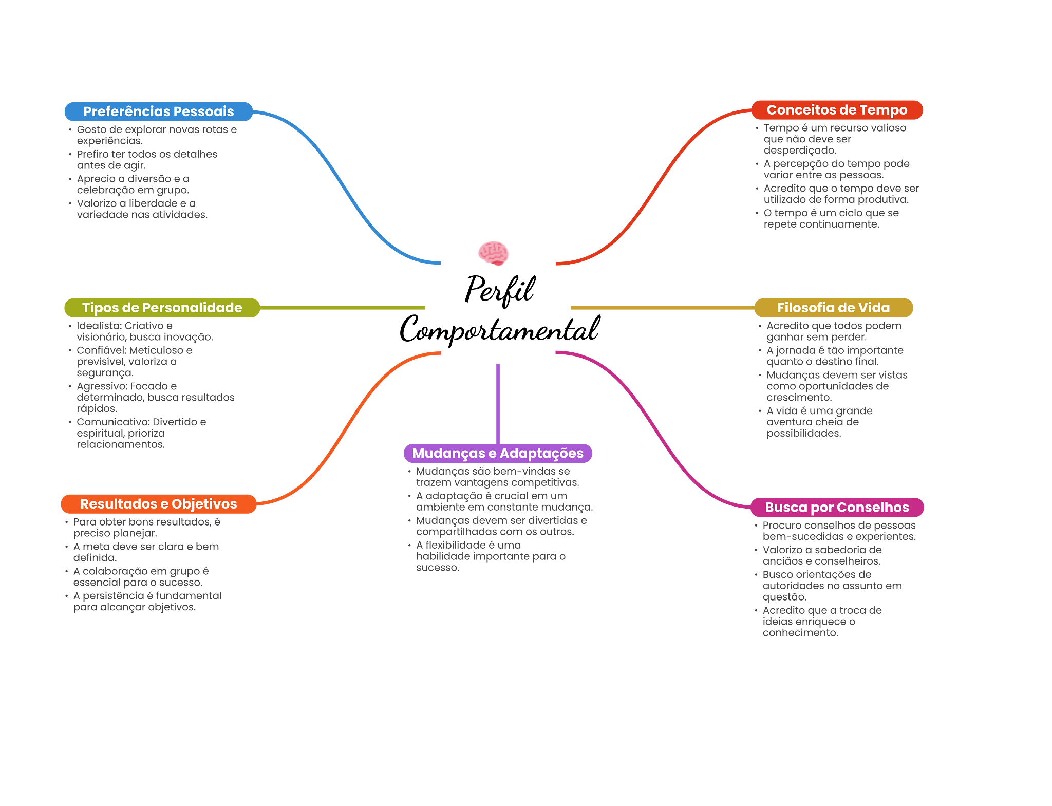 Preferências Pessoais Conceitos de Tempo Gosto de explorar novas rotas Tempo um recurso experiências. que não deve ser Prefiro ter todos detalhes antes de agir. A percepção do tempo pode Aprecio a diversão a entre as celebração em grupo. Acredito que tempo deve ser Valorizo a a utilizado de forma produtiva. variedade atividades. tempo um ciclo que repate Tipos de Personalidade Filosofia de Vida Criativo Acredito que todos podem visionário, busca inovação. ganhar sem perder. Meticuloso A jornada é tão importante previstvel, a quanto destino final. segurança. devem ser vistas Agressivo: Focado oportunidades de determinado, busca resultados crescimento. A vida é uma grande Comunicative: Divertido . aventura de espiritual, priortza possibilidades. relacionamentos. Mudanças e Adaptações trazem A adaptação crucial um Resultados e Objetivos ambiente em constante Busca por Conselhos Para obter resultados, é devem ser preciso planejar. com os outros. Procuro conselhos de pessoas . experientes. A meta ser clara bem A é uma Valorizo a sabedoria de definida. habilidade para . conselheiros. A colaboração em grupo Busco orientações de para o autoridades no em A fundamental questão. para alcançar objetivos. Acredito que a troca de enriquece o conhecimento.