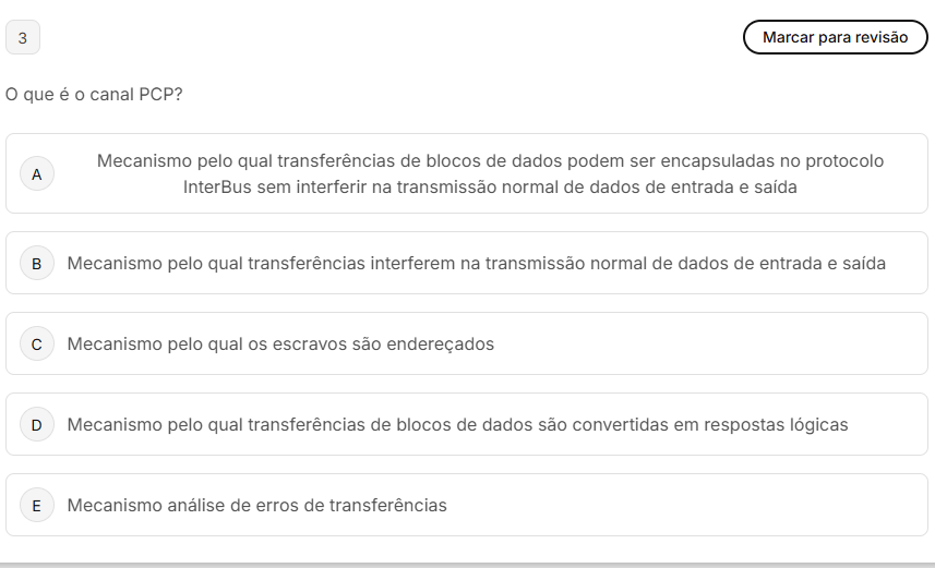 3 Marcar para revisão O que é O canal PCP? Mecanismo pelo qual transferências de blocos de dados podem ser encapsuladas no protocolo A InterBus sem interferir na transmissão normal de dados de entrada e saída B Mecanismo pelo qual transferências interferem na transmissão normal de dados de entrada e saída C Mecanismo pelo qual OS escravos são endereçados D Mecanismo pelo qual transferências de blocos de dados são convertidas em respostas lógicas E Mecanismo análise de erros de transferências