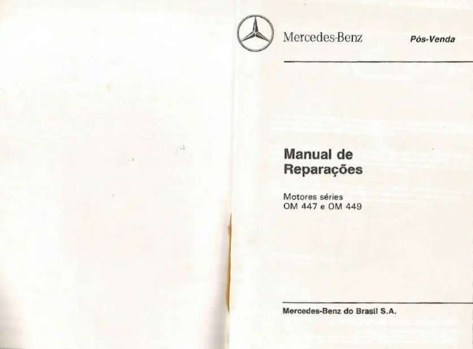 Mercedes-Benz Pós-Venda Manual de Reparações Motores séries OM 447 e OM 449 Mercedes-Benz do Brasil S.A.Atenção: Para assegurar a integridade física dos usuários, e de todas as pessoas diretamen- Quadro sinótico to envolvidas com a manutenção e uso dos produtos Mercedes-Benz, bem como com a segurança e durabilidade dos mesmos, observar de Segurança" Tabela de aplicação dos motores 8 listados no final deste 00 Generalidades Indicações para utilização deste manual Dados gerais do motor 9 Desempenho dos motores 12 1 Os diversos tipos de motores foram agrupados em série, conforme quadro abaixo: Valores de regulagem controle 13 Tabelas de aperto 18 Motores Série OM 447 Série OM 449 01 Bloco do motor 447 OM 449 Dimensões gerais e 23 Tipo de Motor OM 447 A OM 449 A dos alojamentos dos tuchos 23 OM 447 LA OM 449 LA camisas de 24 de 2 As indicações de número de motores e/ou chassis correspondem 6 últimos Dimensões gerais e tolerâncias 25 do número de identificação do agregado e referem-se ao número de Cabeçote do motor Dimensões gerais e 27 3 Quando a compreender de construção do agregado e/ou Sede das válvulas 28 Guias de válvulas 29 4 Para todas as medidas contidas neste manual, desde que não especificada sue unidade, subentende-se que seja o milimetro 03 Árvore de manivelas de usinagens e de montagem 30 Dimensões gerais 31 Perfil dos colos da árvore de manivelas 31 Dimensões dos colos principais e de bielas 32 Casquilhos dos colos principais de bielas Casquilhos dos colos principais 33 dos colos de bielas 33 de vibrações Dimensões gerais 34 do motor Dimensões gerais 35 Dimensões gerais 37 Bucha des 38 Embolos Dimensões e 39 Identicação e codificação dos 40 de segmento 41 4 505 Engrenagens de distribuição 18 Bomba de entre dentes das engrenagens 42 Teste de vazão 59 Regulagem da folga das Valores para controle 59 das válvulas 43 Dimensões e valores de montagem 60 Regulagem da folga válvulas (procedimento) 43 de pressão de segurança Arvore de comando de Dados 61 de montagem 44 Diâmetro dos colos de apoio da árvore de comando e buchas dos mancais 44 20 Bomba d'água Alçamento dos da de comando 44 Dimensões e valores de montagem 62 Válvulas 45 Dados técnicos 63 Dimensões gerais Curso das 46 Itens de segurança 64 Molas das válvulas 46 Tuchos 47 Varetas 48 Balancins 48 07 Sistema de injeção Dados 49 Bicos injetores 48 09 - Turboalimentador Dados técnicos 50 13 Compressor de or Características gerais 51 Rendimento do compressor tempo de 51 Valores de regulagem controle 52 Dimensões gerais e tolerências 53 14 Freio-motor Valores de regulagem e montagem 54 15/54 Equipamentos Tabele de aplicação dos equipamentos elétricos Alternador gerais 56 Teste 56 Dados técnicos 57 Regulador de tensão 57 Motor de partida Características gerais 58 Dados técnicos 58 Teste 58 6 7Quadro Sinótico Dados Gerais 00 Tabela de aplicação dos motores Tipo de construção do motor do motor 475.950 LS 1625 OM 449 LA 475.951 L 1625 L/LK 2325 - LG 1825 26 bar 2.100/min 0,30 475.952 371/400 R OM 449 A 9.973 475.953 0 400 UP 475.954 LB 2325 OM 449 A 475.906-406 Industrial LS 1630 475.982 L/LS 1633 (Argentina) 449 LA 449 Diesel 4 tempos injeção direta 27 bar entre os cilindros de um motor 4 bar 2.200/min 0,25 0,35 475.984 o 371/400 R (México) OHL 1630 Vertical em linha 128,0 155,0 20 bar 476.950 L/LK/LS 1929-2629 600 25/min OM 447 A diesel filtrado Horário 476.916-405 Industrial LS 1935 476.980 L/LS 1938 (Argentina) OM 447 LA 371/400 RS-RSL-RSD 26 bar 2.100/min 0,30 0,50 476.982 LS 1941 6 11.967 476.983 L/LK/LS 1935 2635 OM 447 LA 476.985 371/400 RS-RSL-RSD 476.988 OHL 1635 447 A 16,25:1 476.991 OHL 1635 476-917-506 Industrial OM 447 16,6:1 27 bar 0,25 0,35 476.918-506 Freightliner (México) 21 Regular a folga das válvulas com o motor frio ou pelo menos 30 minutos após desligado técnicas 3) OM 447 LA de construção 476.917-505 e 506 Disposição dos cilindros Ciclo de funcionamento normal variação máx. Descrição Número de Diâmetro dos cilindros Curso dos Cilindrada total Razão de compressão Pressão compressão¹ Rotação de marcha Rotação nominal máxima Início de injeção (APMS) Sentido de rotação do motor admissão escapamento indicado 1) Motor temperatura normal de funcionamento (80 a 4) OM 447 LA de construção e 476.918-506 (vista de frente) 5) OM 449 LA de construção 475.982 6) OM 449 LA de construção 475.984 e OM 447 LA de construção 8) OM 447 LA de construção 476.917-505 e 506 9) OM 447 LA de construção 476.988 10) OM 447 LA de construção 476.985 476.918-506 11) OM 449 LA de construção 475.985 12) OM 449 LA de construção 475.984 Folga das de 8Dados Gerais 00 Dados Gerais 00 Sistema de Lubrificação Sistema de arrefecimento Tipo Lubrificação forçada Sistema pressurizado com circulação de água forçada por meio de bomba Bomba de óleo de engrenagens centrifuga, radiador e válvulas Pressão mínima de óleo imotor à temperatura de 80 a 95° C) em marcha 0,5 bar em 2,5 bar de Elemento único de total Pressão no Depressão Veículos Motor de água no sistema no sistema (bar) (bar) Capacidade de abastecimento óleo lubrificante OM 449 A Cárter 2325 Tipo do motor 30 máximo mínimo 1630 OM 449 LA OM OM 449 A: OM 449 LA 22L 1633 15L OM 449 A OM 449 LA p/ 20L 2,5L 1929/2629 447 A 0,35 OM 447; OM 447 A 1935/2635 26 L 40 OM 447 LA 1938 OM 447 LA 0,10 1941 Sistema de alimentação de combustivel o 371/400 OM 449 A 30 Ordem de injeção 371/400 motores de série OM 447 OM 449 LA 0,80 motores de série OM 449 OHL 1630 0,60 (Dosch) em linha Bomba alimentadora 371/400 54 OM 447 LA Regulador de rotação OHL 1635 Filtro de combustivel elementos de Pressão máxima no sistema bar Para parcial ou total do adicionar 1% volume de solúvel Para abastecimento inicial do sistema após serviços de desengorduração ou desincrustração ou, em caso de montagem de um radiador ou motor adicionar Em regiões cuja tem