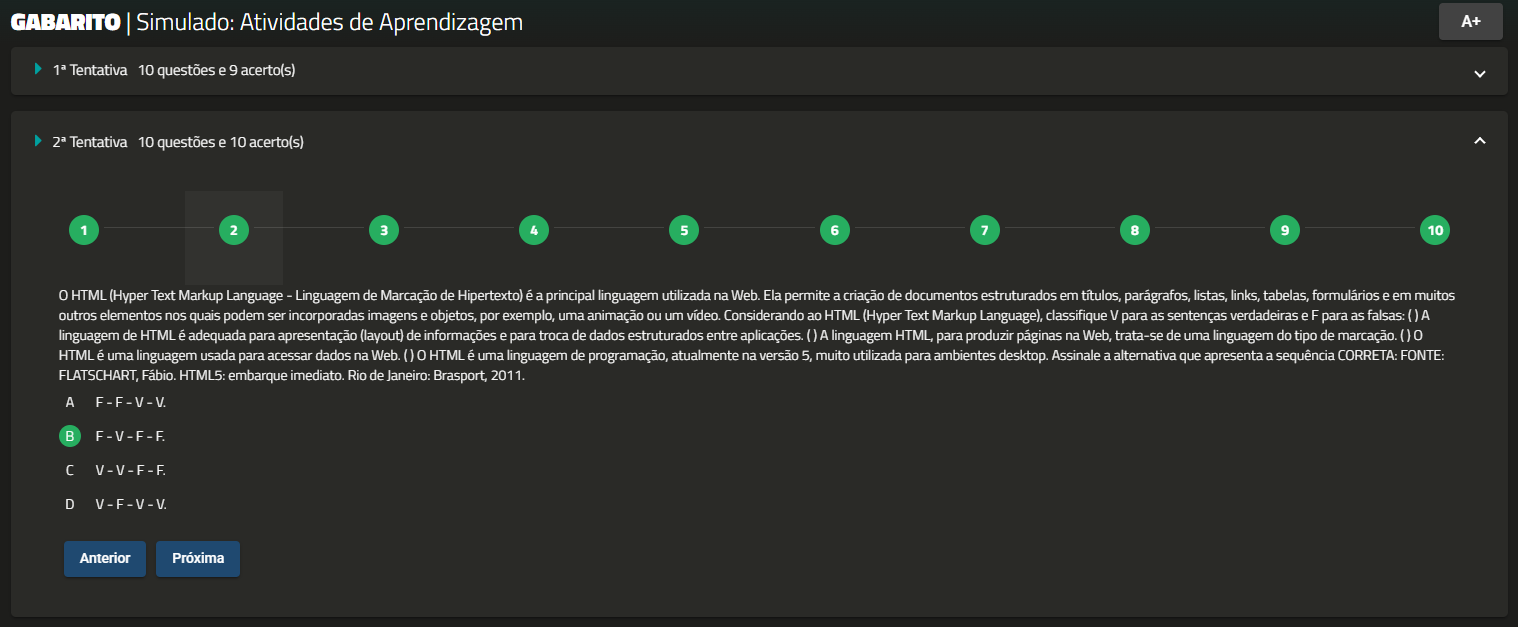 GABARITO Simulado: Atividades de Aprendizagem A+ Tentativa 10 questões e 9 acerto(s) Tentativa 10 questões e 10 acerto(s) 1 2 3 4 5 6 7 8 9 10 0 HTML (Hyper Text Markup Language - Linguagem de Marcação de Hipertexto) é a principal linguagem utilizada na Web. Ela permite a criação de documentos estruturados em títulos, parágrafos, listas, links, tabelas, formulários e em muitos outros elementos nos quais podem ser incorporadas imagens e objetos, por exemplo, uma animação ou um Considerando ao HTML (Hyper Text Markup Language), classifique V para as sentenças verdadeiras e F para as falsas: ()A linguagem de HTML é adequada para apresentação (layout) de informações e para troca de dados estruturados entre aplicações. ()A linguagem HTML, para produzir páginas na Web, trata-se de uma linguagem do tipo de marcação. HTML é uma linguagem usada para acessar dados na Web. HTML é uma linguagem de programação, atualmente na versão 5, muito utilizada para ambientes desktop. Assinale a alternativa que apresenta a sequência CORRETA: FONTE: FLATSCHART, Fábio. HTML5: embarque imediato. Rio de Janeiro: Brasport, 2011. A F-F-V-V. C V-V-F-F. D V-F-V-V. Anterior Próxima