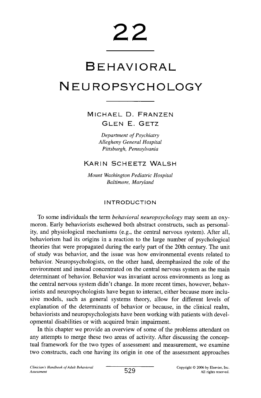 Franzen, M. D., & Smith-Seemiller, L. (1998). Behavioral neuropsychology. In M. Hersen and A. E.