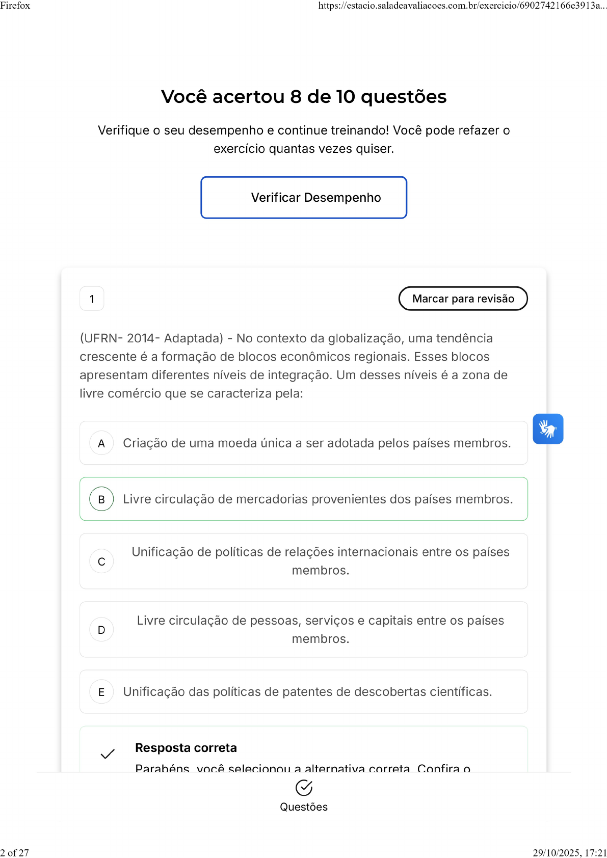 Firefox Você acertou 8 de 10 questões Verifique seu desempenho e continue treinando! Você pode refazer o exercício quantas vezes quiser. Verificar Desempenho 1 Marcar para revisão (UFRN- 2014 Adaptada) No contexto da globalização, uma tendência crescente é a formação de blocos econômicos regionais. Esses blocos apresentam diferentes níveis de integração. Um desses níveis é a zona de livre comércio que se caracteriza pela: A Criação de uma moeda única a ser adotada pelos países membros. Livre circulação de mercadorias provenientes dos países membros. Unificação de políticas de relações internacionais entre os países c membros. Livre circulação de pessoas, serviços e capitais entre os países D membros. E Unificação das políticas de patentes de descobertas científicas. Resposta correta Parabéns você selecionou a alternativa correta Confira o Questões 2 of 27 29/10/2025, 17:21Firefox Gabarito Comentado A alternativa correta é a que afirma que a zona de livre comércio se caracteriza pela livre circulação de mercadorias provenientes dos países membros. Isso significa que, em uma zona de livre comércio, os países membros concordam em eliminar as tarifas e restrições ao comércio de mercadorias entre eles. No entanto, cada país mantém suas próprias políticas comerciais em relação a países não membros. Portanto, a livre circulação de mercadorias é uma característica distintiva de uma zona de livre comércio. 2 Marcar para revisão (Concurso Professor de Educação Básica Área: Anos Iniciais do Ensino Fundamental 2019) Patrimônio Cultural Ferroviário de Domingos Martins está em ruínas "O sítio ferroviário, localizado no Vale da Estação, no município de Domingos Martins, reconhecido como Patrimônio Cultural Ferroviário, nos termos da Lei n° 11.483, de 31 de maio de 2007, encontra-se em ruínas. Esse reconhecimento é um tipo de procedimento que se aplica, exclusivamente, aos bens oriundos do espólio da extinta RFFSA, explicou Iphan. A assessoria de Comunicação do Iphan informou que, por ser um bem operacional, a estação Vale da Estação está sob a responsabilidade do Departamento Nacional de Infraestrutura de Transportes (DNIT), que atua em parceria com o Iphan visando à preservação desses bens. 'Esclarecemos ainda que, desde 2016, o Iphan tem cobrado da Prefeitura de Domingos Martins, que utiliza espaço, a realização de serviços para a preservação da edificação. Em maio desse ano, foi realizada uma reunião com a prefeitura e DNIT para que o município pudesse viabilizar a obra necessária. Atualmente, o Iphan ainda aguarda o retorno da prefeitura sobre as providências que serão tomadas em relação ao bem', informou a assessoria. Em 2018, a arquiteta da prefeitura de Domingos Martins, Fernanda Magnago, esteve visitando o sítio histórico e disse que os imóveis são muito importantes para estado. 'Estive aqui em agosto de 2016, junto com uma arquiteta do Iphan, e descobrimos que só temos quatro patrimônios de ferrovias com valor igual ao do Vale da Estação. O local tem valor histórico Questões 3 of 27 29/10/2025, 17:21Firefox estaçao Terroviaria, uma caixa ae agua ae Terro que a Fumaça e uma casa de turma que abrigava os trabalhadores da linha férrea, da década de 1900" (Folha de Vitória, 28 out. 2019) Patrimônio Cultural Ferroviário, as fotos das estações, a Maria Fumaça, o depoimento de antigos funcionários de Domingos Martins formam um conjunto de vestígios denominado: A Relatos históricos Documentos orais c Museu itinerante D Ferrovias do passado E Fontes históricas Resposta correta Parabéns, você selecionou a alternativa correta. Confira gabarito comentado! Gabarito Comentado conjunto de vestígios formado pelo Patrimônio Cultural Ferroviário, as fotos das estações, a Maria Fumaça e o depoimento de antigos funcionários de Domingos Martins é denominado "Fontes históricas". Essas fontes são registros que fornecem informações sobre o passado e são essenciais para a compreensão e a interpretação da história. Portanto, a alternativa correta é "Fontes históricas". 3 Marcar para revisão Questões 4 of 27 29/10/2025, 17:21Firefox local-global¿local considerando, exponencialmente, campo de forças estabelecido entre a cultura objetiva e a cultura subjetiva. Sobre conceito de lugar é incorreto afirmar: lugar é tido como um intermédio entre mundo e indivíduo. Neste, a lógica do desenvolvimento dos sistemas sociais não se A manifesta pela unidade das tendências opostas à individualidade e à globalidade. A realidade que se constrói no lugar é tensa, pois se refere a um dinamismo que se recria a cada instante/momento entre homens, empresas, instituições e meio ambiente construído. No lugar, as relações são, permanentemente instáveis, em que c globalização e localização, globalização e fragmentação são termos de uma dialética que se refaz com frequência. A individualização e especialização produtiva de cada lugar (re)produz sua rede urbana, função urbana, estrutura e uso do solo, D habitação, renda, segregação social, meios de consumo e informação, papel do Estado, entre outros. A uma maior globalidade corresponde uma maior individualidade. Ao revisitar os lugares, no mundo atual, encontraremos novos significados, novas identidades, pois esses são construídos no E cotidiano/mundo vivido e considera as variáveis: objetos, ações, técnica, informação e tempo. Resposta correta Parabéns, você selecionou a alternativa correta. Confira o gabarito comentado! Gabarito Comentado A resposta certa lugar é tido como um intermédio entre mundo e indivíduo Neste a lógica do desenvolvimento dos sistemas sociais não Questões 5 of 27 29/10/2025, 17:21Firefox A resposta correta é a alternativa pois lugar é tido como um intermédio entre mundo e indivíduo, e a lógica do desenvolvimento dos sistemas sociais se manifesta pela unida