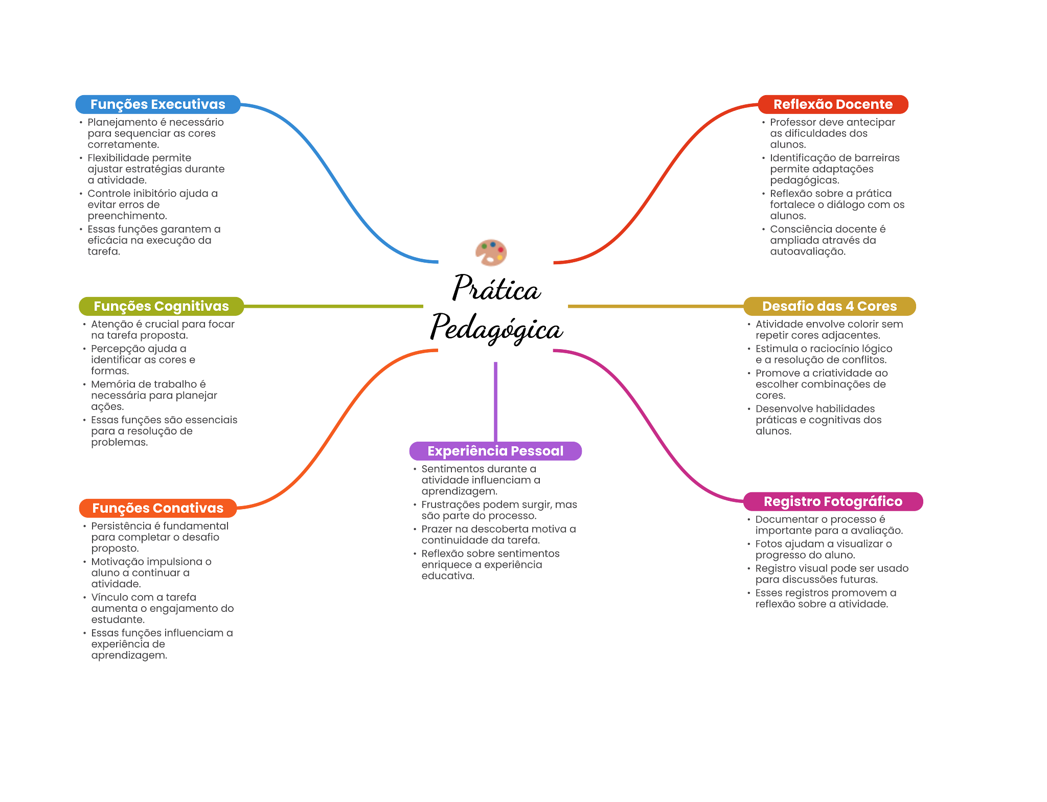 Funções Executivas Reflexão Docente é Professor deve antecipar para as cores as dos corretamente. alunos. Flexibilidade permite de barreiras ajustar durante permite adaptações a atividade. Controle ajuda a sobre a prática erros de fortalece com preenchimento. funções a Consciência docente é eficácia na execução da atravée da autoavaliação. Funções Cognitivas Desafio das 4 Cores Atenção é crucial para focar Atividade envolve colorir sem na tarefa proposta. repetir cores adjacentes. Percepção ajuda a Estimula o lógico as cores a resolução de formas. Promove a criatividade . Memória de trabalho combinações de necesória para cores. ações. Desenvolve habilidades Essas funções são essenciale cognitivos dos para a resolução de problemas. Experiência Pessoal Sentimentos durante a atividade a aprendizagem. Funções Conativas Frustrações podem surgir, mas Registro Fotográfico são parte do processo. Persistência é fundamental Documentor processo na descoberta motiva a para importante para a continuidade da proposto. Fotos ajudam a visualizar sobre sentimentos Motivação progresso do aluno. enriquece a experiência aluno a continuar a Registro visual pode ser usado educativa. atividade. para discussões com a tarefa registros promovem a do sobre a atividade. estudante. funções a experiência de