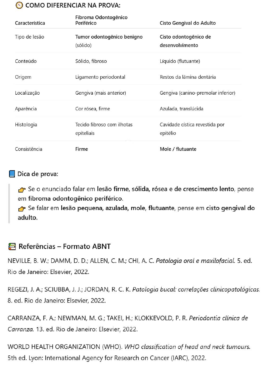 COMO DIFERENCIAR NA PROVA: Fibroma Odontogênico Característica Periférico Cisto Gengival do Adulto Tipo de lesão Tumor odontogênico benigno Cisto odontogênico de (sólido) desenvolvimento Conteúdo Sólido, fibroso Líquido (flutuante) Origem Ligamento periodontal Restos da lâmina dentária Localização Gengiva (mais anterior) Gengiva (canino-premolar inferior) Aparência Cor rósea, firme Azulada, translúcida Histologia Tecido fibroso com ilhotas Cavidade cística revestida por epiteliais epitélio Consistência Firme Mole / flutuante Dica de prova: Se o enunciado falar em lesão firme, sólida, rósea e de crescimento lento, pense em fibroma odontogênico periférico. Se falar em lesão pequena, azulada, mole, flutuante, pense em cisto gengival do adulto. Referências Formato ABNT NEVILLE, W.; DAMM, D. D.; ALLEN, C. M.; CHI, A. C. Patologia oral e maxilofacial. 5. ed. Rio de Janeiro: Elsevier, 2022. REGEZI, J. A.; SCIUBBA, J. J.; JORDAN, R. C. Patologia bucal: correlações clinicopatológicas. 8. ed. Rio de Janeiro: Elsevier, 2022. CARRANZA, F. A.; NEWMAN, M. G.; TAKEI, H.; KLOKKEVOLD, P.R. Periodontia clínica de Carranza. 13. ed. Rio de Janeiro: Elsevier, 2022. WORLD HEALTH ORGANIZATION (WHO). WHO classification of head and neck tumours. 5th ed. Lyon: International Agency for Research on Cancer (IARC), 2022.