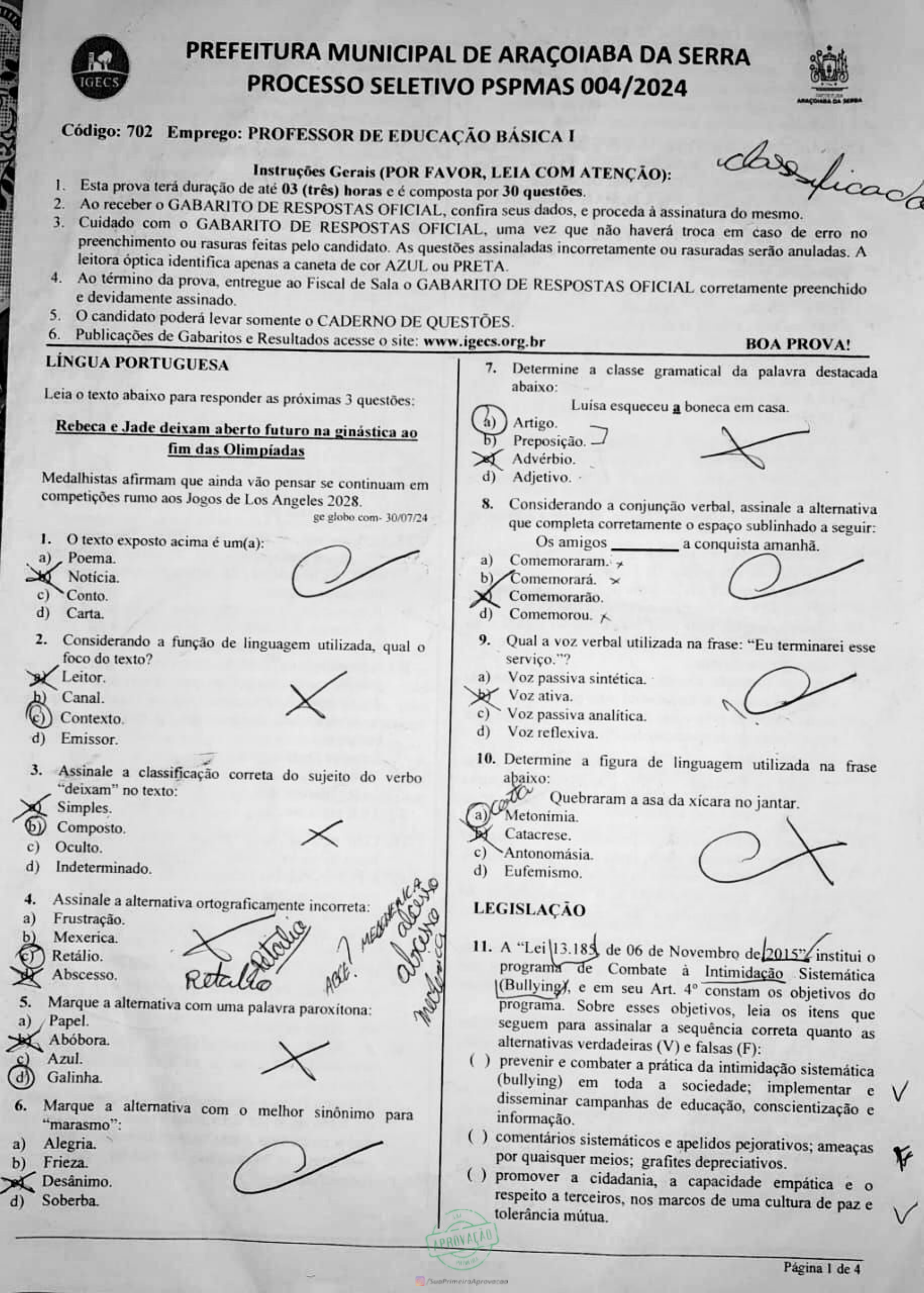 PREFEITURA MUNICIPAL DE ARAÇOIABA DA SERRA IGECS PROCESSO SELETIVO PSPMAS 004/2024 Código: 702 Emprego: PROFESSOR DE EDUCAÇÃO BÁSICA I Instruções Gerais (POR FAVOR, LEIA COM ATENÇÃO): 1. Esta prova terá duração de até 03 (três) horas e é composta por 30 2. Ao receber o GABARITO DE RESPOSTAS OFICIAL, confira seus dados, e proceda à assinatura do mesmo. 3. Cuidado com o GABARITO DE RESPOSTAS OFICIAL, uma vez que não haverá troca em caso de erro no preenchimento ou rasuras feitas pelo candidato. As questões assinaladas incorretamente ou rasuradas serão A leitora óptica identifica apenas a caneta de cor AZUL ou PRETA. 4. Ao término da prova, entregue ao Fiscal de Sala o GABARITO DE RESPOSTAS OFICIAL corretamente preenchido e devidamente assinado. 5. o candidato poderá levar somente o CADERNO DE QUESTÕES. 6. Publicações de Gabaritos e Resultados acesse o site: www.igecs.org.br BOA PROVA! LÍNGUA PORTUGUESA 7. Determine a classe gramatical da palavra destacada abaixo: Leia o texto abaixo para responder as próximas 3 questões: Luisa esqueceu a boneca em casa. Artigo. Rebeca e Jade deixam aberto futuro na ginástica ao b) Preposição. fim das Olimpíadas Advérbio. Medalhistas afirmam que ainda vão pensar se continuam em d) Adjetivo. competições rumo aos Jogos de Los Angeles 2028. 8. Considerando a conjunção verbal, assinale a alternativa ge globo com- 30/07/24 que completa corretamente o espaço sublinhado a seguir: 1. texto exposto acima é um(a): Os amigos a conquista a) a) Comemoraram. Notícia. b) c) Conto. d) Carta. d) Comemorou. 2. Considerando a função de linguagem utilizada, qual o 9. Qual a voz verbal utilizada na frase: "Eu terminarei esse foco do texto? serviço."? Leitor. a) Voz passiva sintética. Voz ativa. Canal. c) Voz passiva Contexto. d) Voz d) Emissor. 10. Determine a figura de linguagem utilizada na frase 3. Assinale a classificação correta do sujeito do verbo abaixo: "deixam" no texto: Quebraram a asa da xicara no jantar. Simples. a Composto. Catacrese. c) c) Antonomásia. d) d) 4. Assinale a alternativa ortograficamente incorreta: LEGISLAÇÃO a) Frustração. b) Mexerica. Retálio. 11. A de 06 de Novembro de institui o Abscesso. 5. Marque a alternativa com uma palavra programa de Combate à Intimidação Sistemática e em seu Art. constam os objetivos do programa. Sobre esses objetivos, leia os itens que a) Papel. seguem para assinalar a sequência correta quanto as Abóbora. alternativas verdadeiras (V) e falsas (F): c) Azul. ( ) prevenir e combater a prática da intimidação sistemática Galinha. (bullying) em toda a sociedade; implementar e disseminar campanhas de educação, conscientização e 6. Marque a alternativa com o melhor sinônimo para informação. comentários sistemáticos e apelidos pejorativos; ameaças a) Alegria. por quaisquer meios; grafites depreciativos. b) Frieza. Desânimo. promover a cidadania, a capacidade empática e o d) Soberba. respeito a terceiros, nos marcos de uma cultura de paz e tolerância mútua. Página I de 4702 PROFESSOR DE EDUCAÇÃO BÁSICA a) b) Assinale a alternativa que indica a correta área de atuação prioritária dos Estados e do Distrito Federal: d) Ensino Fundamental e Educação Infantil. Ensino Fundamental e Ensino Médio. 12. Art 6 da "Lei 13.146, de 6 de julho de 2015 Lei Ensino Técnico e Superior. Brasileira de Inclusão da Pessoa com Ensino Fundamental e Pré-escola. Deficiência/Estatuto da com afirma CONHECIMENTOS PEDAGÓGICOS que a deficiência não afeta a plena capacidade civil da pessoa, inclusive para: 16. No livro "Avaliar para promover: as setas do I- exercer o direito de decidir sobre o número de filhos e de Jussara Hoffmann afirma que a finalidade primeira da ter acesso a informações adequadas sobre reprodução e avaliação é sempre promover a melhoria da realidade planejamento familiar. educacional e não descrevê-la ou classifica-la. Nesse II- exercer o direito à à tutela, à curatela e à adoção, sentido, considerando os pressupostos defendidos pela como adotante ou adotando, em igualdade de autora acerca da avaliação educacional, avalie os itens oportunidades com as demais pessoás. abaixo para assinalar a alternativa correta: Avalie os itens acima para assinalar a alternativa correta: Os processos avaliativos podem e devem estar a) Somente está fundamentados, apenas, em princípios, critérios e regras b) Somente está correto. da investigação científica e considerações le estão corretos. metodológicas. d) e Il estão errados. A avaliação educacional, ao lidar com a complexidade do ser humano, deve orientar-se por valores morais e 13. A "Lei 9.394, de 20 de dezembro de em seu paradigmas Art. afirma que os estabelecimentos de ensino, Somente I está correto. respeitadas as normas comuns e as do seu sistema de Somente está correto. ensino, terão algumas incumbências. c) e estão corretos. Com relação a essas incumbências, assinale a alternativa d) e estão errados. correta: articular-se com as famílias e a comunidade, criando 17. Levando em consideração o livro "Desenvolvimento processos de integração da sociedade com a escola; psicológico e educação Vol. 2", avalie os itens abaixo elaborar e executar sua proposta administrar sobre a psicologia da educação para assinalar a seu pessoal e seus recursos materiais e financeiros. alternativa correta: b) educação digital, com foco no letramento digital e no A psicologia da educação, como disciplina educacional ensino de computação, programação, robótica e outras de natureza aplicada, trata do estudo dos fenômenos e competências digitais. dos processos educacionais. c) oferta de formação técnica e profissional e inclusão de II- A psicologia da educação não se trata de uma disciplina vivências práticas de trabalho no setor produtivo. psicológica, o que significa que a aproximação do estudo d) oferecimento de programas de educação continuada para dos educa