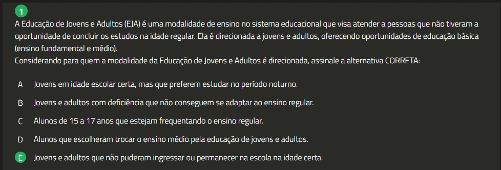 1 A Educação de Jovens e Adultos (EJA) é uma modalidade de ensino no sistema educacional que visa atender a pessoas que não tiveram a oportunidade de concluir estudos na idade regular. Ela é direcionada a jovens e adultos, oferecendo oportunidades de educação básica (ensino fundamental e médio). Considerando para quem a modalidade da Educação de Jovens e Adultos é direcionada, assinale a alternativa CORRETA: A Jovens em idade escolar certa, mas que preferem estudar no período noturno. B Jovens e adultos com deficiência que não conseguem se adaptar ao ensino regular. C Alunos de 15 a 17 anos que estejam frequentando 0 ensino regular. D Alunos que escolheram trocar 0 ensino médio pela educação de jovens e adultos. E Jovens e adultos que não puderam ingressar ou permanecer na escola na idade certa.