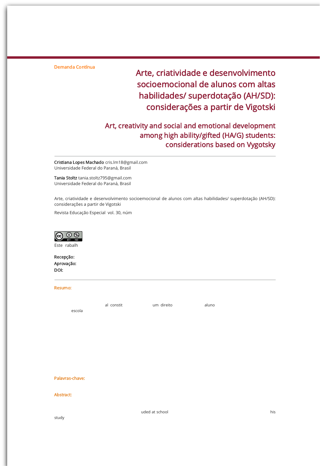 Demanda Contínua Arte, criatividade e desenvolvimento socioemocional de alunos com altas habilidades/ superdotação (AH/SD): considerações a partir de Vigotski Art, creativity and social and emotional development among high ability/gifted (HA/G) students: considerations based on Vygotsky Cristiana Lopes Machado cris.lm18@gmail.com Universidade Federal do Paraná, Brasil Tania Stoltz tania.stoltz795@gmail.com Universidade Federal do Paraná, Brasil Arte, criatividade e desenvolvimento socioemocional de alunos com altas habilidades/ superdotação (AH/SD): considerações a partir de Vigotski Revista Educação Especial, vol. 30, núm. 58, pp. 441-454, 2017 Universidade Federal de Santa Maria Este trabalho está sob uma Licença Creative Commons Atribuição-NãoComercial 3.0 Internacional. Recepção: 07 Julho 2016 Aprovação: 21 Dezembro 2016 DOI: https://doi.org/10.5902/1984686X23030 Resumo: A educação de alunos com altas habilidades/superdotação (AH/SD) é assegurada pela legislação em vigor que admite esse discente como sujeito de direito à educação especial (BRASIL, 1996; VIRGOLIM, 2012; PISKE, 2014b). Contudo, mesmo a educação especial constituindo-se como um direito, muitos desses alunos encontram-se em situação de exclusão escolar (FREITAS; REICH, 2015). Diante disso, o objetivo do presente estudo é investigar as implicações da arte e da criatividade para o desenvolvimento socioemocional de alunos com AH/SD no contexto inclusivo. Essa investigação se justifica na medida em que procura explicitar o potencial educativo das atividades artísticas e criativas. Este estudo possui caráter qualitativo e é de natureza exploratória. Para tanto, adotamos como instrumentos de coleta de dados a entrevista semiestruturada e a observação. Os participantes desse estudo foram 10 alunos identificados com AH/SD, estudantes da rede de ensino de um município no Estado do Paraná e frequentadores de Sala de Recursos Multifuncional. A partir da análise dos dados, baseada em Aguiar e Ozella (2006), foi possível perceber que a arte e a criatividade constituem-se como instrumentos que auxiliam esse discente a lidar com seu mundo interior, como também possibilitam oportunidades para o emprego do potencial criativo e inovador. Nesse sentido, o estudo aponta para a necessidade de revisão das práticas pedagógicas destinadas aos discentes com potencial superior, como também para a investigação de metodologias de ensino que integrem as atividades artísticas e criativas em suas práticas educacionais. Palavras-chave: Educação Especial, Altas habilidades, superdotação, Arte. Abstract: The education of high ability/gifted (HA/G) students is assured by prevailing legislation which provides gifted children with the right to special education (BRASIL, 1996; VIRGOLIM, 2012; PISKE, 2014b). However, although special education is a right, many gifted children find themselves excluded at school (FREITAS; REICH, 2015). In view of this, the purpose of this study is to investigate the implications of art and creativity to the social and emotional development of HA/G students in an inclusive context. This investigation is justified in that it seeks to explain the educational potential of artistic and creative activities. This is an exploratory qualitative study focussing on a case study. As such the data collection instruments we used were a semi-structured interview. The participants of this study were ten students identified as being HA/G attending public schools in a municipality in the State of Paraná. Based on the analysis of the data it was possible to perceive that art and creativity are an instrument that assists HA/G students in coping with their inner world, as well as providing opportunities for making use of their creative and innovative potential. As such this study points to https://creativecommons.org/licenses/by-nc/3.0/ https://creativecommons.org/licenses/by-nc/3.0/ https://creativecommons.org/licenses/by-nc/3.0/ https://doi.org/10.5902/1984686X23030 the need to review teaching practices directed towards students with greater potential, as well as the need to investigate teaching methods which integrate artistic and creative activities in their educational practices. Keywords: Special education, High ability, giftedness, Art. Introdução A educação especial, sob o enfoque da perspectiva inclusiva, tem como premissa norteadora a valorização da diversidade no contexto escolar, tendo a instituição de ensino o papel de se adaptar e proporcionar medidas pedagógicas que atendam às particularidades do aluno que apresenta necessidades educacionais especiais, como também auxiliar no desenvolvimento de potenciais, respeitar as diferenças e atender aos alunos de acordo com suas necessidades educacionais especiais (BRASIL, 2001). Nesse sentido, a Política Nacional de Educação Especial na Perspectiva da Educação Inclusiva (BRASIL, 2007), por sua vez, estabelece como objetivo o acesso, a participação e a garantia de aprendizagem dos alunos com deficiência, transtornos globais do desenvolvimento e altas habilidades/superdotação nas escolas regulares, ao passo que também propõe a orientação às instituições de ensino com o objetivo de atender às necessidades educacionais desses discentes. No que se refere especialmente aos discentes com altas habilidades/superdotação, Sabatella (2008) aponta que em nosso país há estimativa de que teríamos em nossa população quase 9 milhões de sujeitos talentosos e superdotados. Diante disso, para a autora, esse registro evidencia e justifica a preocupação em elaborar ações educacionais específicas destinadas aos alunos com potencial acima da média. Contudo, mesmo que a inclusão escolar desses estudantes seja prática em algumas instituições de ensino de nosso país, alguns alunos que apresentam altas habilidades/superdotação ainda encontram-se excluídos do contexto escolar (FREITAS; RECH, 2015). De a