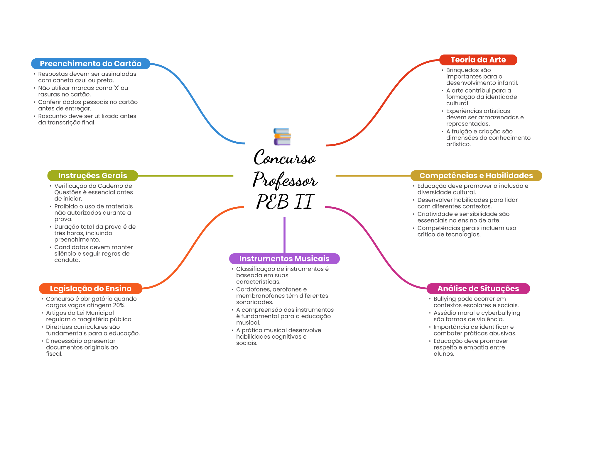 Teoria da Arte Preenchimento do Cartão Brinquedos são devem para com azul ou preta. desenvolvimento Não utilizar marcas como ou A arte contribui para a rasuras no cartão. formação da Confertr dados no cartão cultural. de entregar. Experiências artísticas Rascunho deve ser utilizado ser . da transcrição final. representadas. A fruição e criação dimensões do conhecimento Instruções Gerais Competências e Habilidades Verificação do Cademo de Educação deve promover a Questões é essencial antes diversidade cultural. de Desenvolver habilidades para lidar Proibido uso de com diferentes contextos. não autorizados durante a Criatividade sensibilidade são prova. essenciale no ensino de arte. Duração total da prova de Competências incluem uso horas, critico de preenchimento. devem manter silêncio seguir de conduta. Instrumentos Musicais Classificação de em características. Legislação do Ensino Cordofones, aerofones Análise de Situações Concurso obrigatório quando sonoridades. Bullying pode ocorrer em cargos vagos atingem escolares socials. Artigos da Lei Municipal A dos público. fundamental para a educação e cyberbullying são formas de violência. musical. Diretrizes são para a educação. A prática musical Importância de identificar É combater abusivas. Educação deve promover documentos originale empatia entre fiscal. alunos.