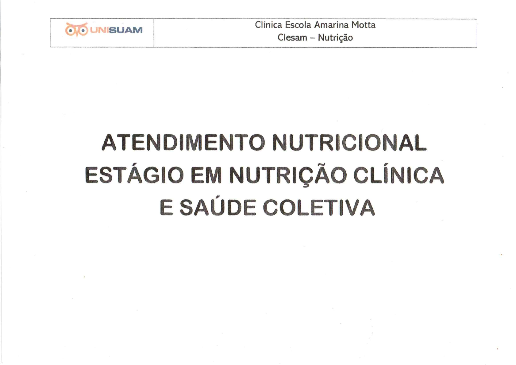 Clínica Escola Amarina Motta UNISUAM Clesam - Nutrição ATENDIMENTO NUTRICIONAL ESTÁGIO EM NUTRIÇÃO CLÍNICA E SAÚDE COLETIVAMINISTÉRIO DA SAÚDE Secretaria de Atenção à Saúde Departamento de Atenção Básica Quais são os índices antropométricos e demais parâmetros adotados pela Vigilância Nutricional, segundo as recomendações da Organização Mundial da Saúde e do Ministério da Saúde? Quadro 3 Índices antropométricos e demais parâmetros adotados para a vigilância nutricional, segundo recomendações da Organização Mundial de Saúde e do Ministério da Saúde FASES DO CURSO DA VIDA ÍNDICES E PARÂMETROS Peso por idade Estatura por idade Crianças Peso por IMC por idade a,b IMC por idadeᵇ Adolescentes Estatura por IMC Adultos Circunferência da Idosos IMC por semana Gestantes Ganho de peso Fontes: a (WHO, 2006) b (WHO, 2007) (WHO, 1995) (WHO, 2000) e (THE NUTRITION SCREENING INITIATIVE, 1994) I (ATALAH SAMUR, E., 1997) (INSTITUTE OF MEDICINE, 1990) 12Clínica Escola Amarina Motta UNISUAM Clesam - Nutrição Medindo crianças maiores de 2 anos, Medindo crianças maiores de 2 anos, adolescentes e adultos adolescentes e adultos passo passo passo passo passo passo 1Clínica Escola Amarina Motta UNISUAM Clesam Nutrição Pesando crianças maiores de 2 Pesando de 2 Pesando crianças malores de 2 passo 19 passo passo passo passo pesso passo 39 passo 99 passo Pesando maiores de 2 passo 119 passo 2Clínica Escola Amarina Motta UNISUAM Clesam Nutrição AVALIAÇÃO DO ESTADO NUTRICIONAL ANTROPOMETRIA Peso Altura IMC = Peso (kg)/ Altura² (m) Fórmula Peso Classificação do estado nutricional de adultos segundo IMC do = IMC Classificação IMCClínica Escola Amarina Motta UNISUAM Clesam - Nutrição Parte inferior das costelas Cintura Ponto mais alto do do quadril Circunferência da cintura, de acordo com sexo Risco de complicações metabólicas associadas à obesidade Sexo Elevado Muito elevado Homem ≥ 94 cm ≥ 102 cm Mulher ≥ 80 cm ≥ 88 cm Fonte: OMS, 1998 4Clínica Escola Amarina Motta UNISUAM Clesam Nutrição circunferência da cintura (cm) RCQ circunferência da cintura (cm) HOMENS MULHERES >0,9 Quadril Quadril Relação Homens Mulheres Cintura Quadril Ideal 0,8 0.7 Baixo Risco 0,85 5Clínica Escola Amarina Motta UNISUAM Clesam - Nutrição Medidas de Circunferência: Circunferência do Braço (CB) Valores do NHANES I apresentados em por Frisancho Adequação da CB (%) - CB obtida (cm) 100 CB do 50 Estado nutricional segundo a CB Dean. Dem. Eutrofia Sobrepe Obes. Grave Moder Love 120% 6Clínica Escola Amarina Motta UNISUAM Clesam - Nutrição Taxa Metabólica Basal Faixa etária (anos) Masculino Feminino 0-3 59,512 P 30,4 58,317 31,1 3-10 22,706 + 504,3 20,315 + 485,9 10-18 17,686 + 658,2 13,384 P + 692,6 18-30 15,057 + 692,2 14,818 486,6 30-60 11,472 P + 873,1 8,126 P + 845,6 >60 11,711 P + 587,7 9,082 658,5 Fonte: FAO, 2004. P:peso em kg. 7Clínica Escola Amarina Motta UNISUAM Clesam - Nutrição CRIANÇAS E ADOLESCENTES NEE (Necessidade Estimada de Energia) Estágio de vida Requerimento estimado de energia 0 a 3 meses NEE = (89 X peso - 100) + 175 kcal 4 a 6 meses NEE = (89 X peso 100) + 56 kcal 7 a 12 meses NEE = (89 peso 100) + 22 kcal 13 a 36 meses NEE = (89 X peso - 100) + 20 kcal Crianças e adolescentes de 3 a 18 anos Meninos NEE = 88,5 61,9 X idade + AF (26,7 X peso + 903 altura) + 20 kcal 9 a 18 anos NEE = 88,5 61,9 idade + AF X (26,7 X peso + 903 altura) + 25 kcal Meninas 3 a 8 anos NEE = 135,3 - 30,8 idade + AF X (10,0 X peso + 934 altura) + 20 kcal 9 a 18 anos NEE = 135,3 30,8 X idade + AF (10,0 X peso + 934 X altura) + 25 kcal Adolescentes com sobrepeso e obesidade Homens NEE = 114 50,9 X idade + AF X (19,5 PESO + 1161,4 ALTURA) Mulheres NEE = 389 41,2 X idade + AF X (15 X PESO + 701,6 ALTURA) 21Clínica Escola Amarina Motta UNISUAM Clesam Nutrição AF (fator de atividade física) - NEE - EUTROFIA Sedentário Pouco ativo Ativo Muito ativo Crianças e adolescentes de 3 a 18 anos Meninos 1,00 1,13 1,26 1,42 Meninas 1,00 1,16 1,31 1,56 AF (fator de atividade física) - NEE - SOBREPESO / OBESIDADE Sedentário Pouco ativo Ativo Muito ativo Crianças e adolescentes de 3 a 18 anos Meninos 1,00 1,12 1,24 1,45 Meninas 1,00 1,18 1,35 1,60 DISTRIBUIÇÃO VET (%) 1 a 3 anos 4 a 18 anos CARBOIDRATO 45 - 65 45 - - 65 PROTEÍNA 5 - 20 10 - - 30 LIPÍDIO 30 40 25 - 35 CÁLCULO DE PROTEÍNA: IDADE PROTEÍNA g/KG/DIA 2 - 6 MESES 2,2 6 12 MESES 1,6 1,2 4 6 ANOS 1,1 7 10 ANOS 1,0 22Clínica Escola Amarina Motta UNISUAM Clesam Nutrição NEE (Necessidade Estimada de Energia) Adultos de 19 anos ou mais (EUTROFIA) Homens NEE = 662 - - 9,53 X idade + AF X (15,91 X peso + 539,6 X altura) Mulheres NEE = 354 - 6,91 X idade + AF X (9,36 X peso + 726 X altura) Adultos de 19 anos ou mais (SOBREPESO E OBESIDADE) Homens NEE = 1086 10,1 X Idade + AF X (13,7 Peso + 416 X Altura) Mulheres NEE = 448 - 7,95 X Idade + AF X (11,4 X Peso + 619 X Altura) AF (fator de atividade física) EER Sedentário Pouco ativo Ativo Muito ativo Adultos de 19 anos ou mais (EUTROFIA) Homens 1,00 1,11 1,25 1,48 Mulheres 1,00 1,12 1,27 1,45 Adultos de 19 anos ou mais (SOBREPESO E OBESIDADE) Homens 1,00 1,12 1,29 1,59 Mulheres 1,00 1,16 1,27 1,44 FONTE: DRI IOM (2002/2005) 8Clínica Escola Amarina Motta SUAM Clesam - Nutrição VENTA KCAL SUBSTITUIÇÃO EM KCAL: SUBSTITUIÇÃO NOS GRUPOS: 1 = 256 1 CARNE = 148 KCAL 1 CARNE = 1,5 = 384 1 LEITE = 122 KCAL 1 LEITE = 1 CER./ TUB. / LEG. = 45 KCAL 3 CEREAIS/TUBÉRCULOS/LEGUMINOSAS = 2,5 = 640 VEG. B = 23 1 PÃO = 3 = 768 PÃO = 138 2 FRUTAS 3,5 = 896 FRUTA = 66 4 = 1.024 CÁLCULO DA INGESTA HÍDRICA: JOVEM: 40 ML/KG/DIA ADULTO: 35 ML/KG/DIA IDOSO DE 55 A 75 ANOS: 30 ML/KG/DIA IDOSO > 75: 25 ML/KG/DIA 24Clínica Escola Amarina Motta UNISUAM Clesam - Nutrição DISTRIBUIÇÃO DE MACRONUTRIENTES POR VET NA DISTRIBUIÇÃO: CHO - 55%; LIP 30%; PTN - 15% VET: 1500 Kcal PTN: 225 KCAL 56G / LIP: 450 KCAL - 50G / CHO: 825 KCAL - 206G ALIMENTOS PORÇÃO PROTEÍN