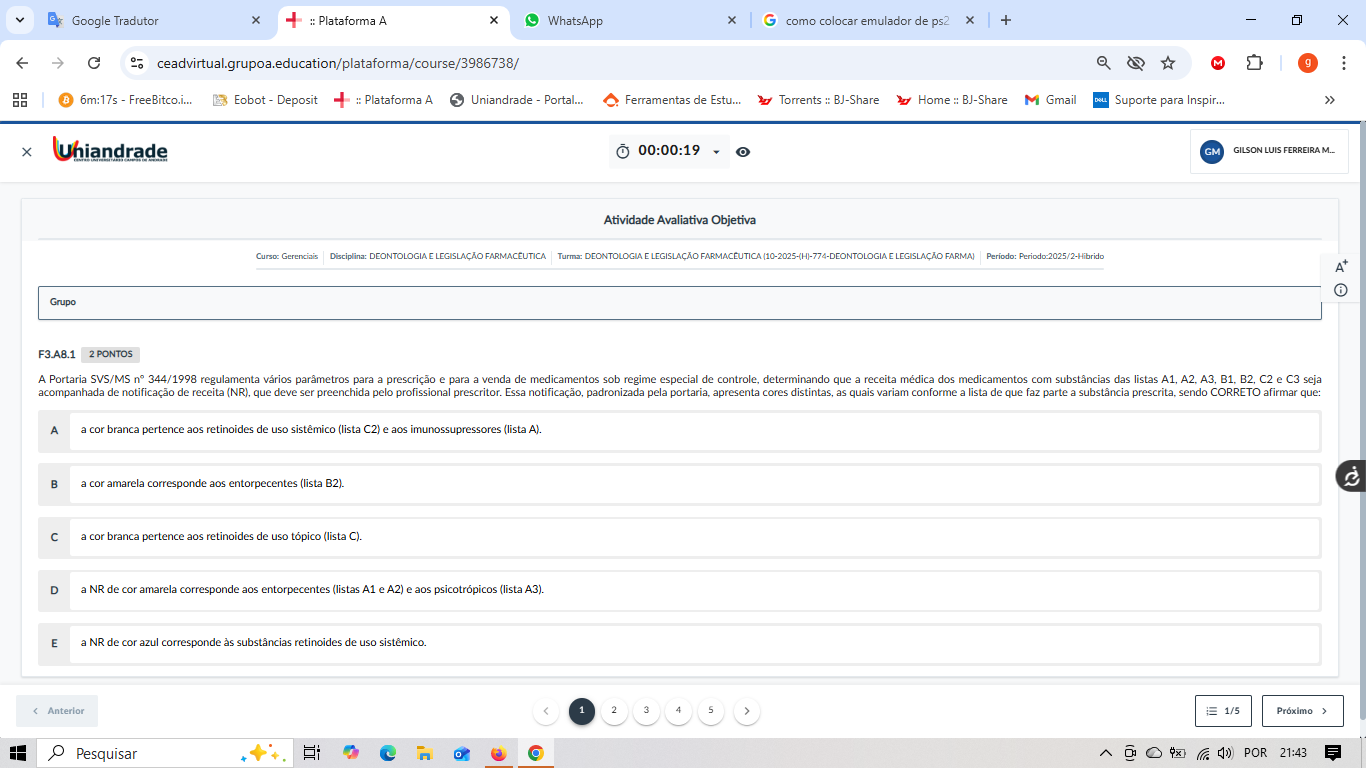 Google Tradutor X : Plataforma A X WhatsApp como colocar emulador de ps2 + X ceadvirtual.grupoa.education/plataforma/course/3986738/ g 6m:17s Eobot Deposit Plataforma A Uniandrade Portal... Ferramentas de Estu... Torrents BJ-Share Home BJ-Share Gmail Suporte para Inspir... » Iniandrade 00:00:19 GM GILSON LUIS FERREIRA Atividade Avaliativa Objetiva Curso: Gerenciais Disciplina: DEONTOLOGIA E LEGISLAÇÃO DEONTOLOGIA E LEGISLAÇÃO 10-2025-(H)-774-DEONTOLOGIA FARMA) i Grupo F3.A8.1 2 PONTOS A Portaria SVS/MS n° 344/1998 regulamenta parâmetros para a prescrição e para a venda de medicamentos sob regime especial de determinando que a receita médica dos medicamentos com substâncias das listas A1, A2. A3, B2, C2 e C3 seja acompanhada de notificação de receita que deve ser preenchida pelo profissional prescritor. Essa padronizada pela portaria, apresenta cores distintas, as quais variam conforme a lista de que faz parte a substância sendo CORRETO afirmar que: A a cor branca pertence aos retinoides de uso sistêmico (lista C2) e aos imunossupressores (lista A). B a cor amarela corresponde aos entorpecentes (lista B2). C a cor branca pertence aos retinoides de uso tópico (lista C). D a NR de cor amarela corresponde aos entorpecentes (listas A1 e A2) e aos psicotrópicos (lista A3). E a NR de cor azul corresponde às substâncias retinoides de uso sistêmico. Anterior 1/5 > Pesquisar POR 21:43